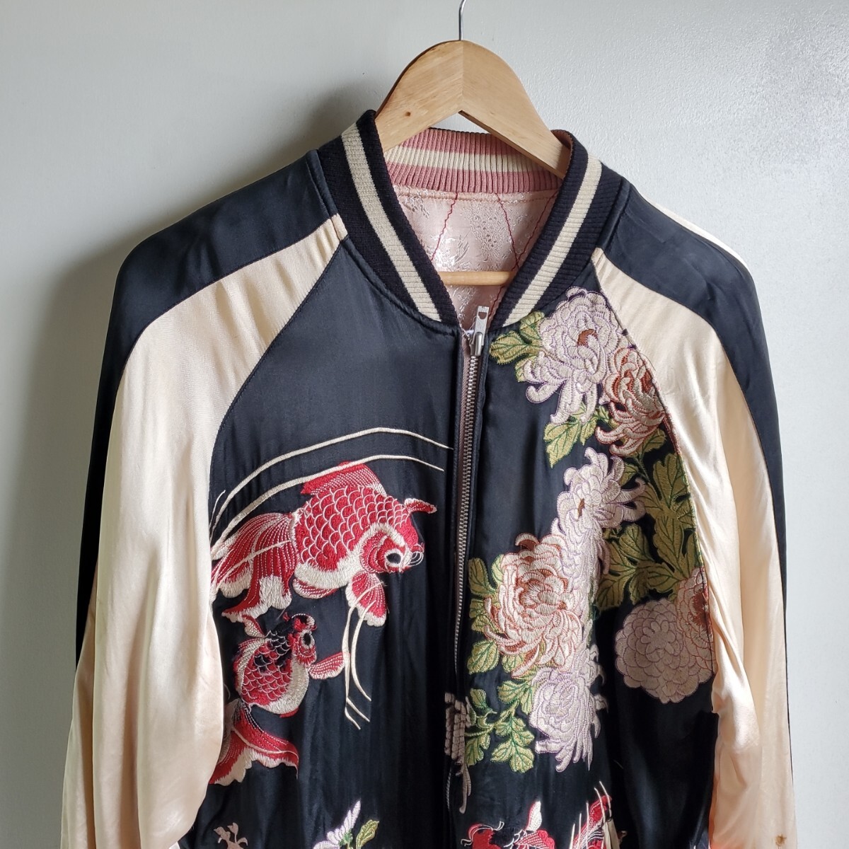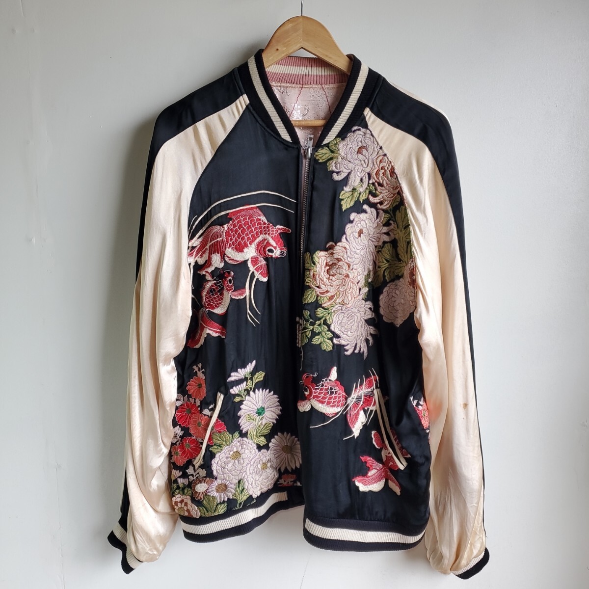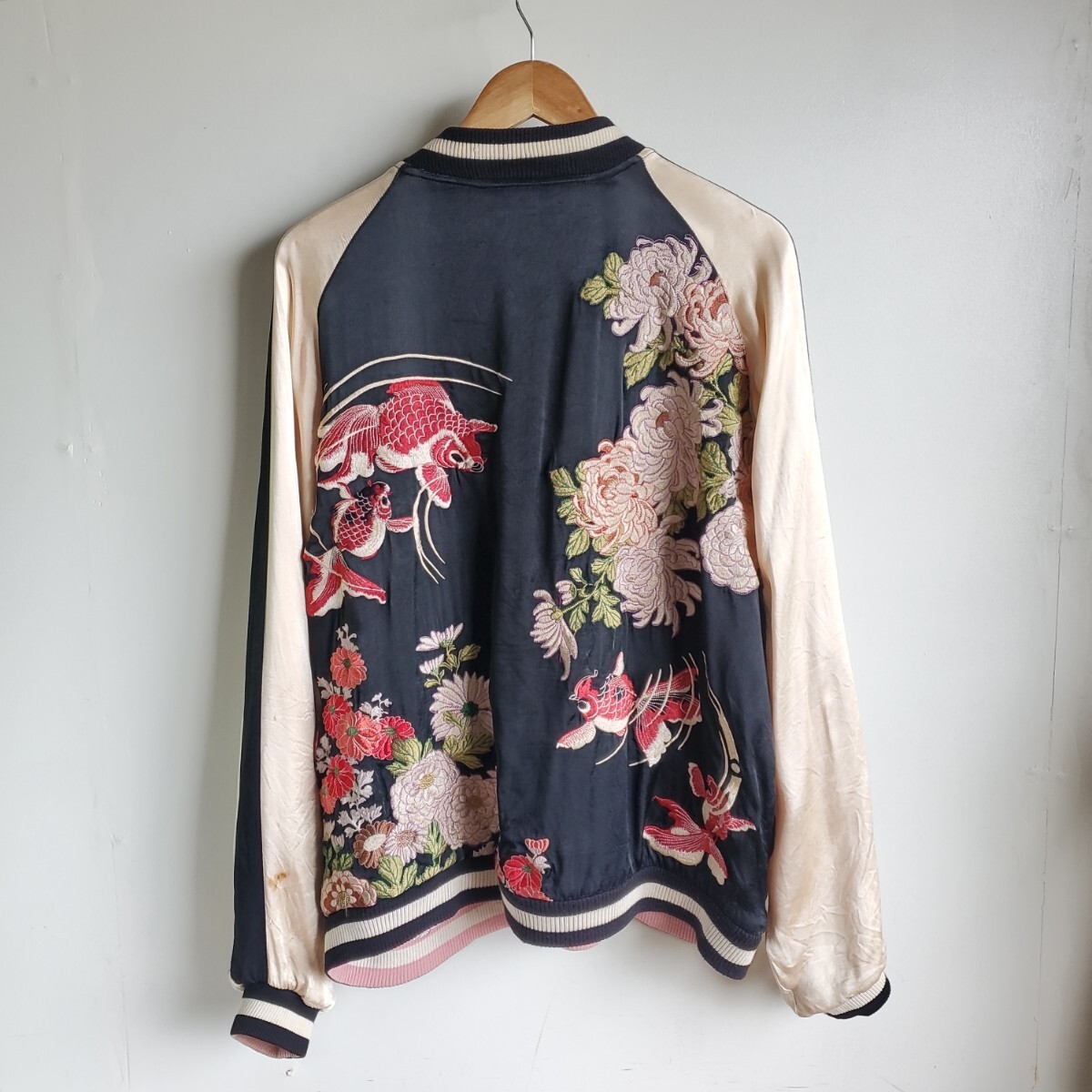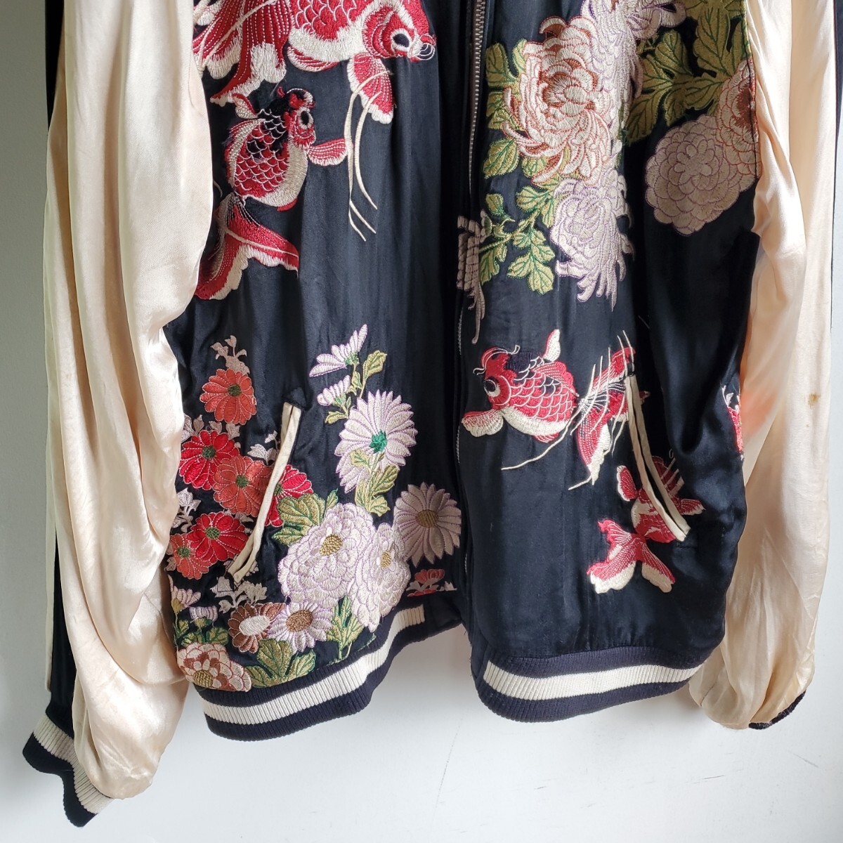 1122◆【sizeXL】花旅楽団 リバーシブル スカジャン 金魚 らんちゅう菊 花 総柄 黒 ブラック ピンク 刺繍 豪華 和柄 中古 USED