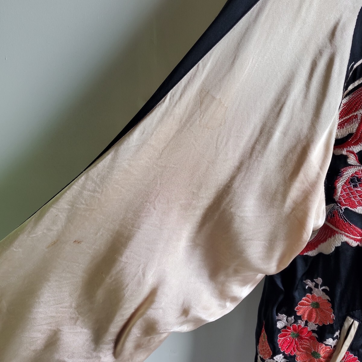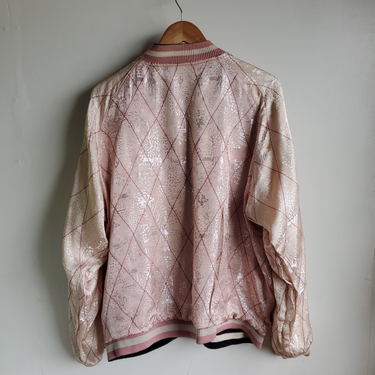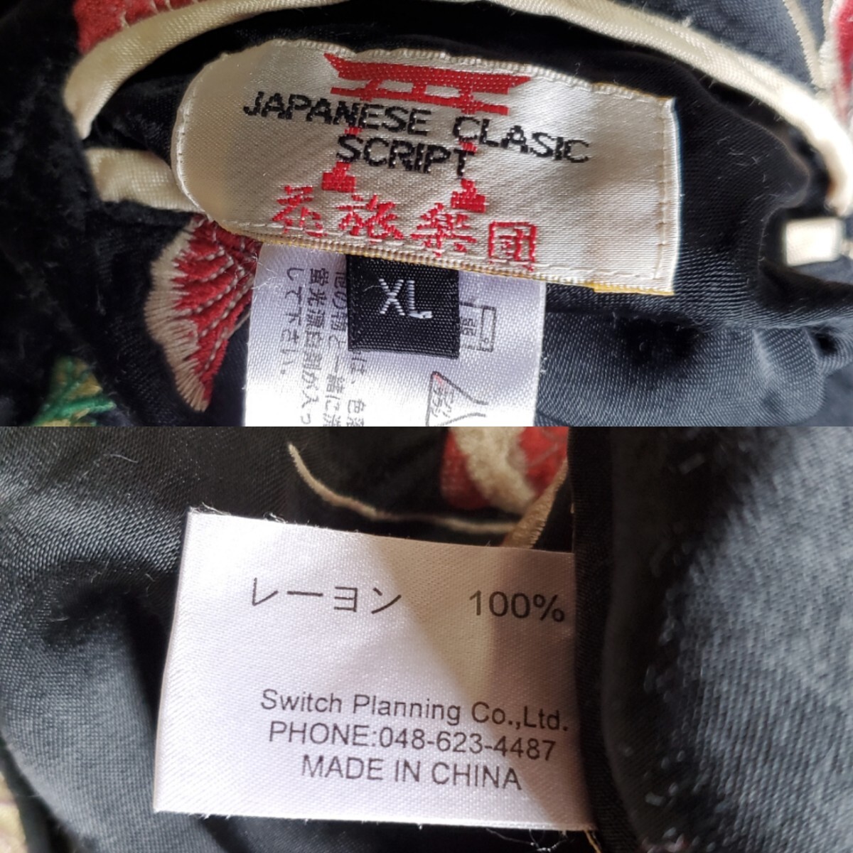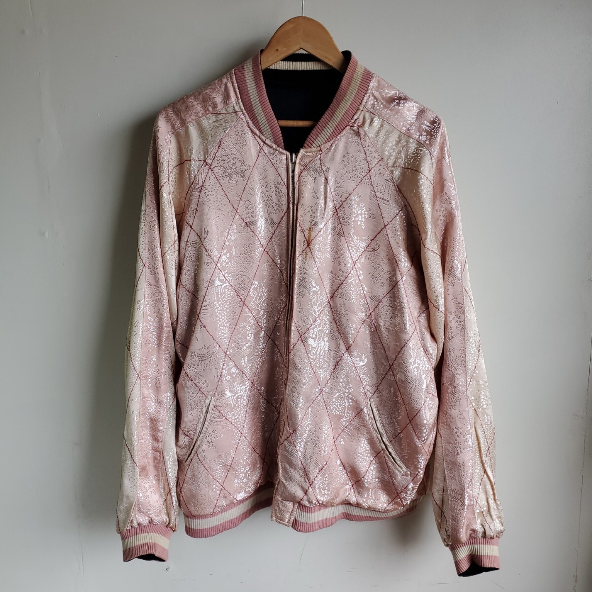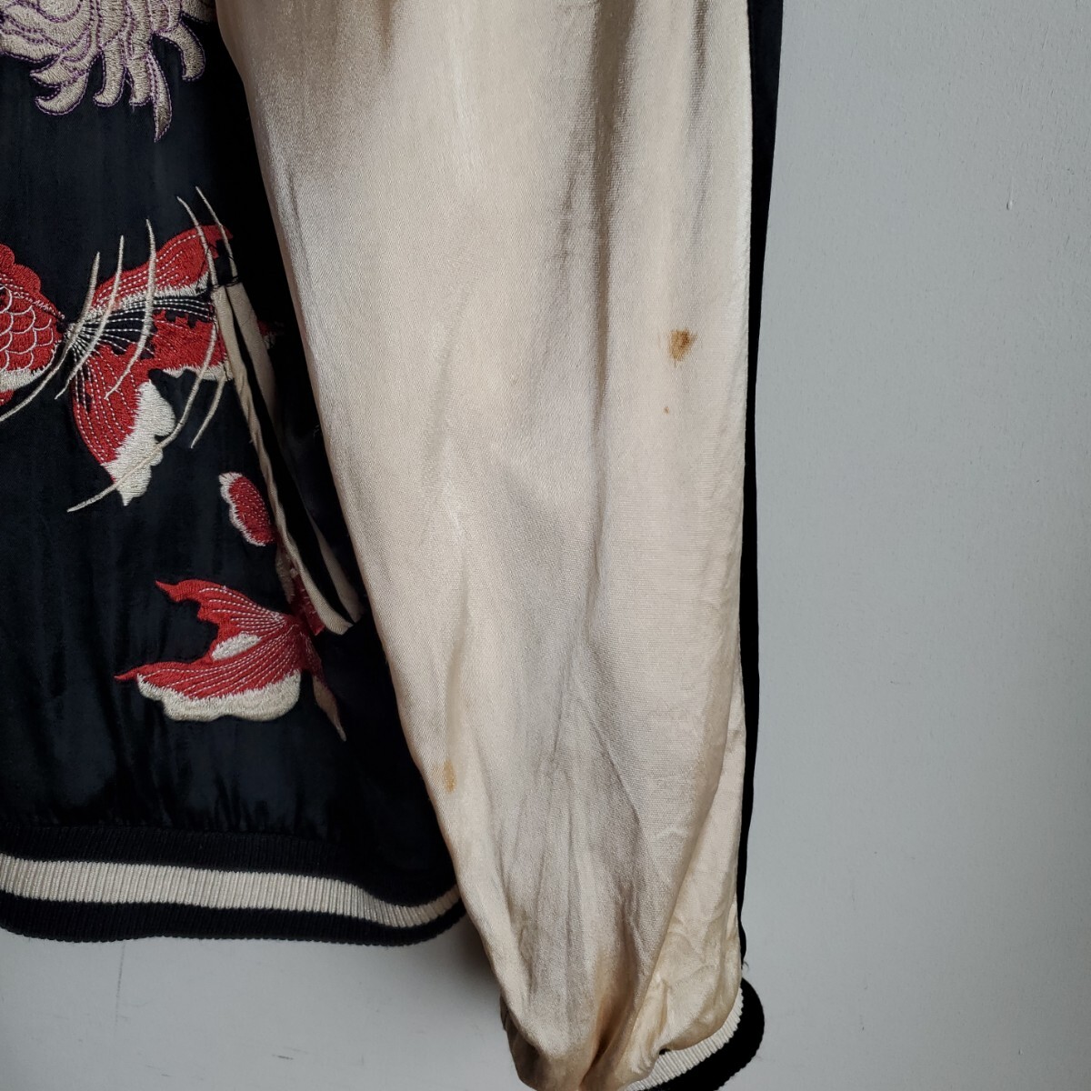 1122◆【sizeXL】花旅楽団 リバーシブル スカジャン 金魚 らんちゅう菊 花 総柄 黒 ブラック ピンク 刺繍 豪華 和柄 中古 USED