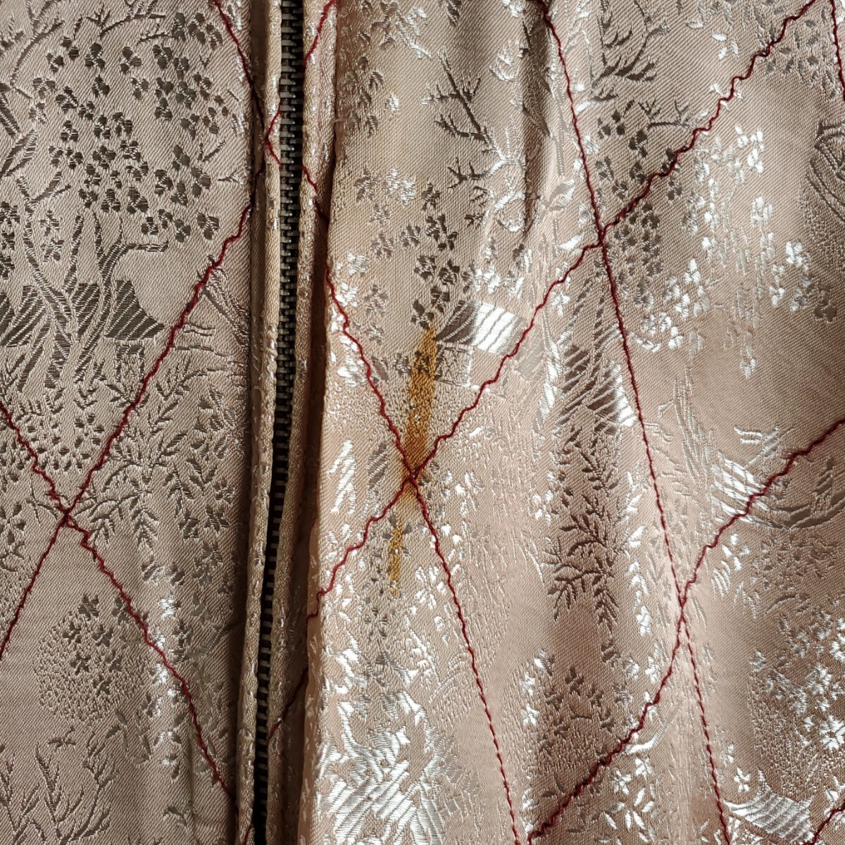 ピンクの面の正面や袖にシミ汚れ個所が多数あり。