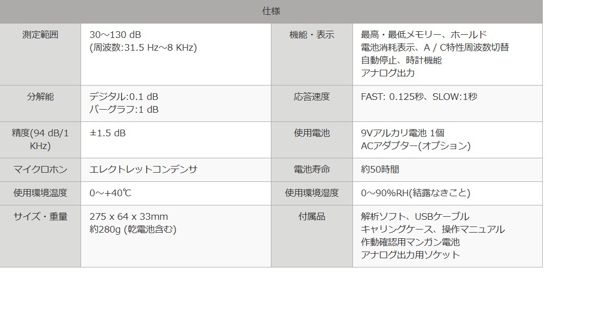 ■メモリー数32000を有するデータロガー機能により、測定間隔を1秒から59秒の間で設定し、騒音と測定日時を自動記録できます。記録したデータは付属の解析ソフトとRS232Cケーブルを使用し、パソコンにダウンロードできます。