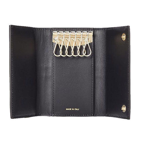 キーケースはゴールドの6連リング仕様。2箇所のスナップボタン留めでしっかりとホールドしてくれます。