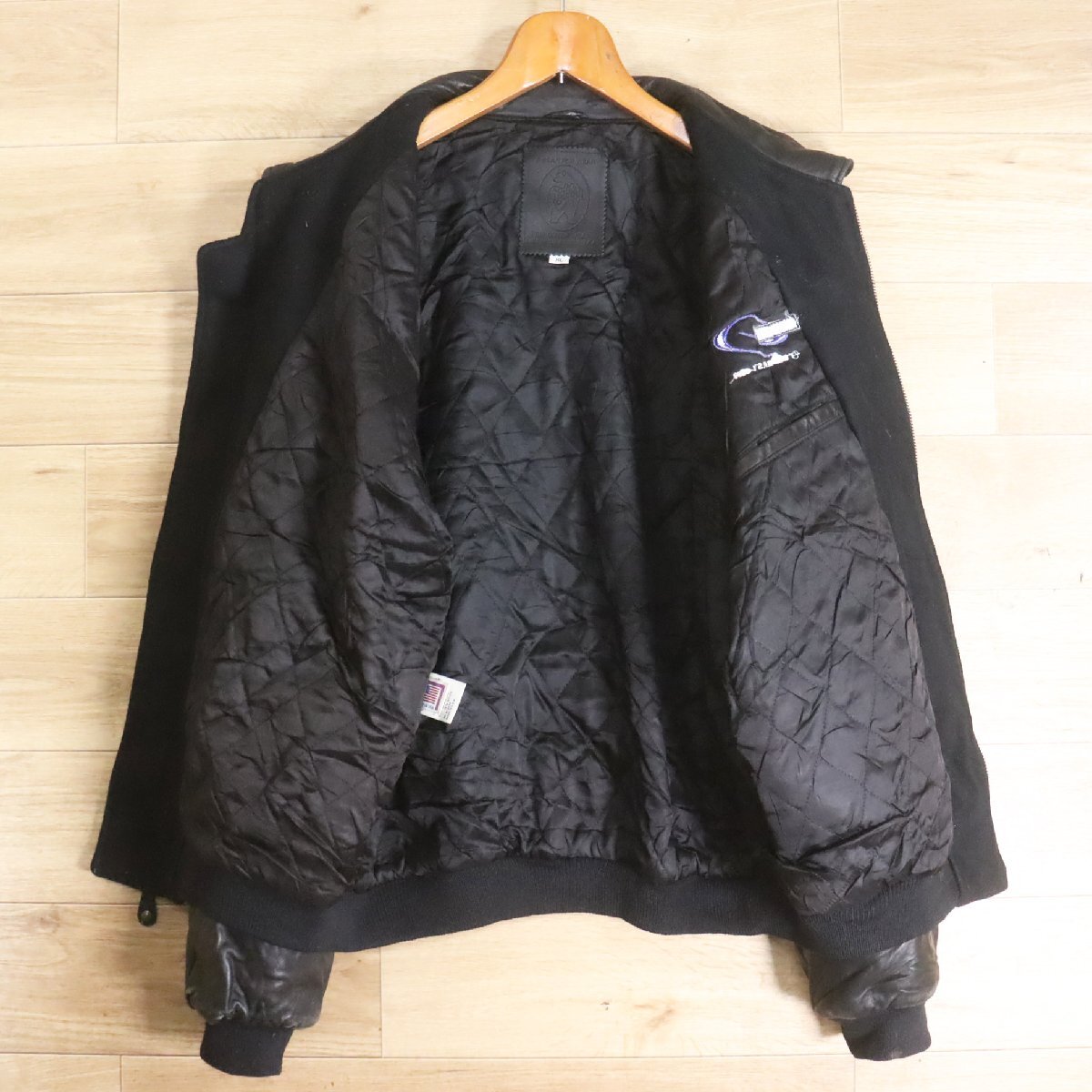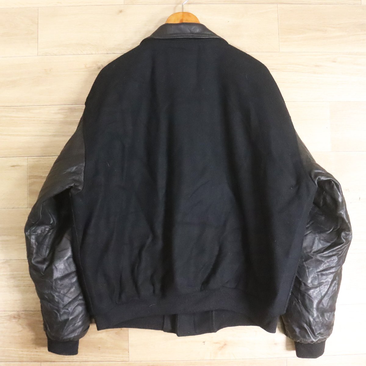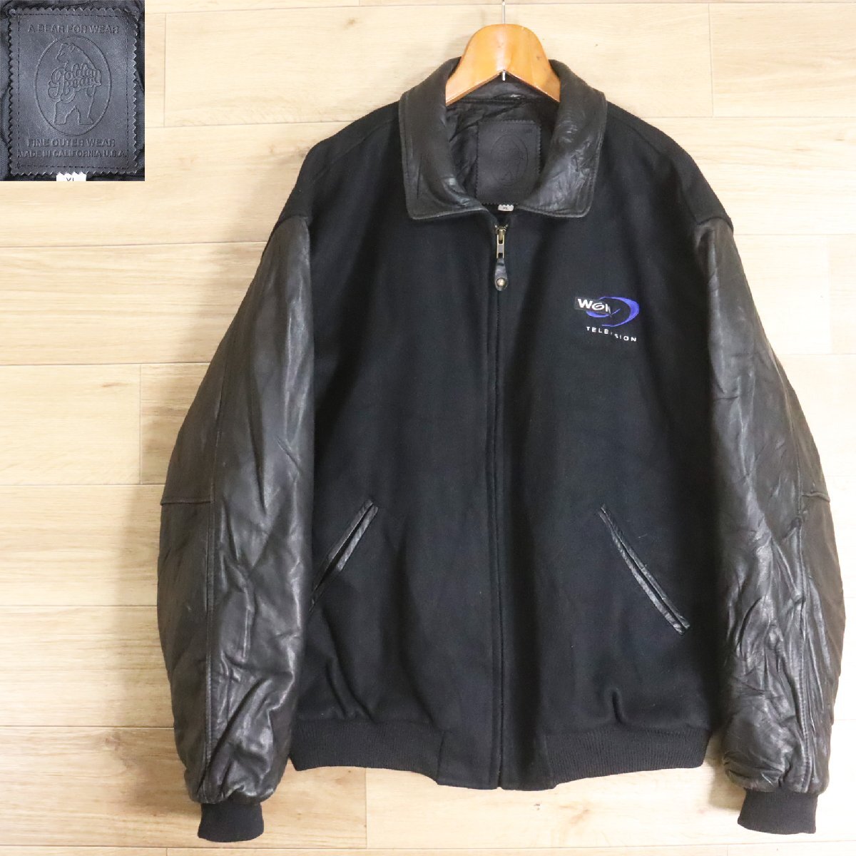B13R/Y6.12-2 USA製 Golden Bear 袖革ウールスタジャン 本革 ジップアップ ブルゾン 刺繍 XL ブラック アメリカ古着