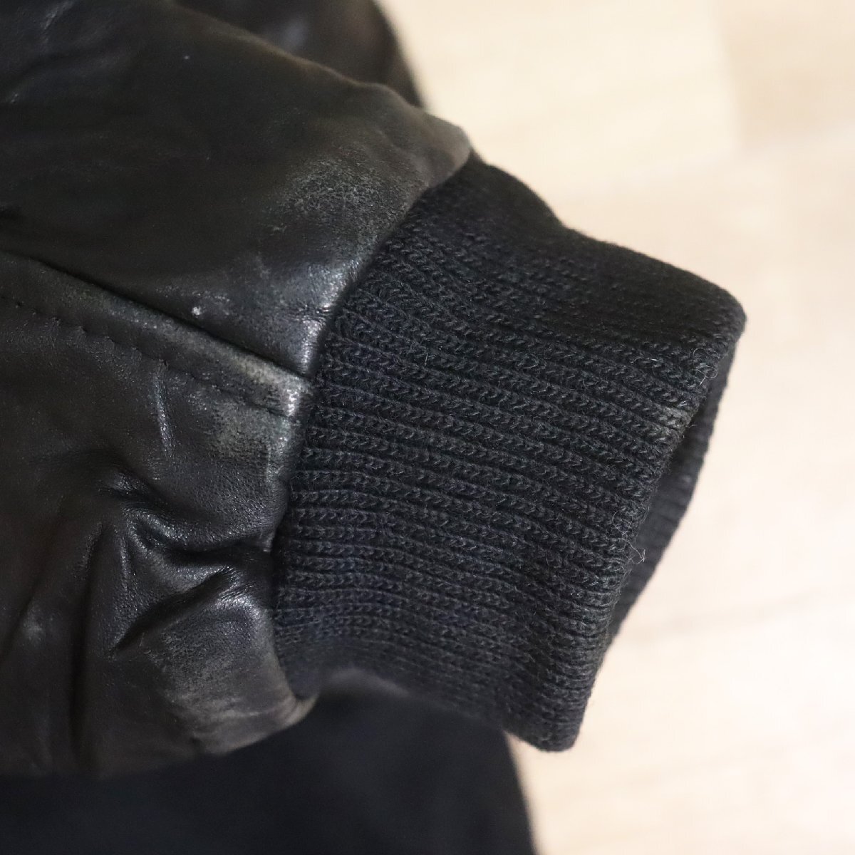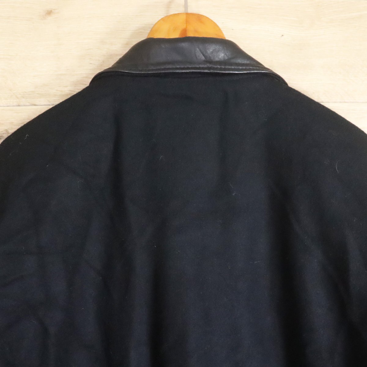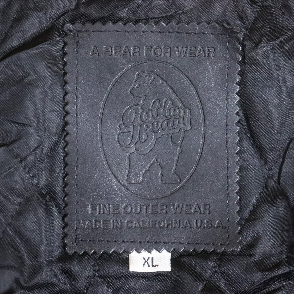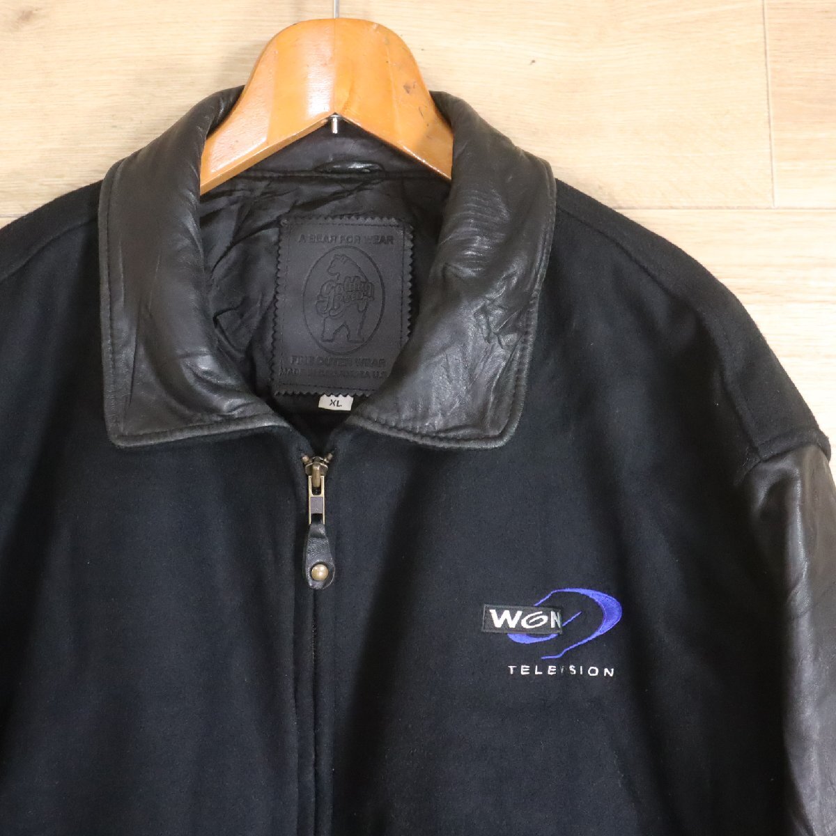 B13R/Y6.12-2 USA製 Golden Bear 袖革ウールスタジャン 本革 ジップアップ ブルゾン 刺繍 XL ブラック アメリカ古着