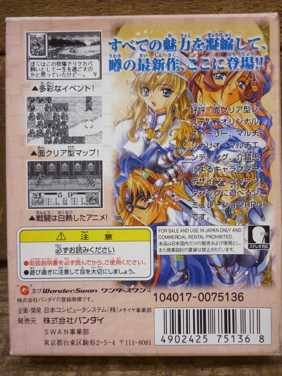 根強いファンを持つシミュレーションRPG「ラングリッサー」シリーズのワンダースワン版です。コレクション整理のため出品いたします。動作未確認品です。箱・説明書が揃った御品です。レトロゲームとして、発売から年月が経過しているため、状態は画像にてご判断ください。