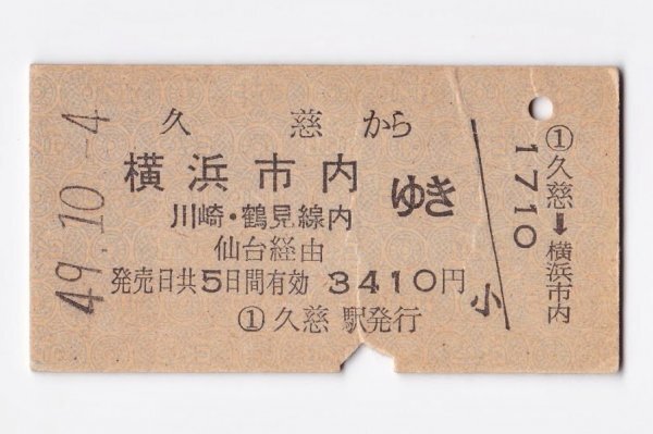●国鉄●八戸線【 久慈から横浜市内 川崎・鶴見線内ゆき 仙台経由 3410円 】A型券 昭和49年 久慈駅発行 【00012】