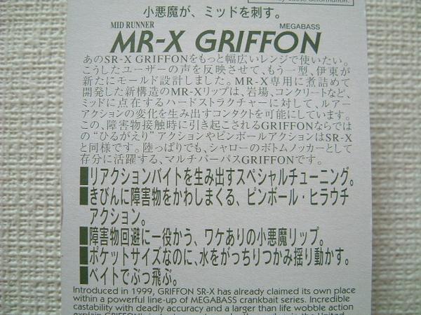 【特徴】 ●MR-X GRIFFONは、水深1.5m~2.5mまで、ウィードやグラスの先端や沈下ストラクチャーのトップが絡むエリアに、ファーストムービングアタックを可能としたルアーです。ミッドレンジのグラスフィールドだけでなく、リップラップ、レイダウンなど、ミッドに点在するハードストラクチャーとのコンタクト性を高め、GRIFFONならではの、驚異的な障害物回避能力を発揮
