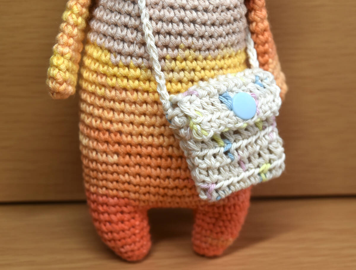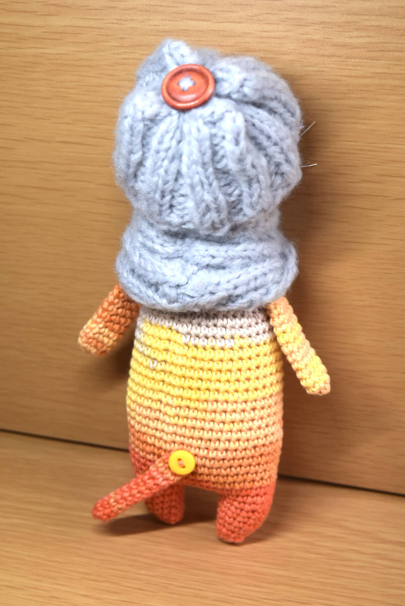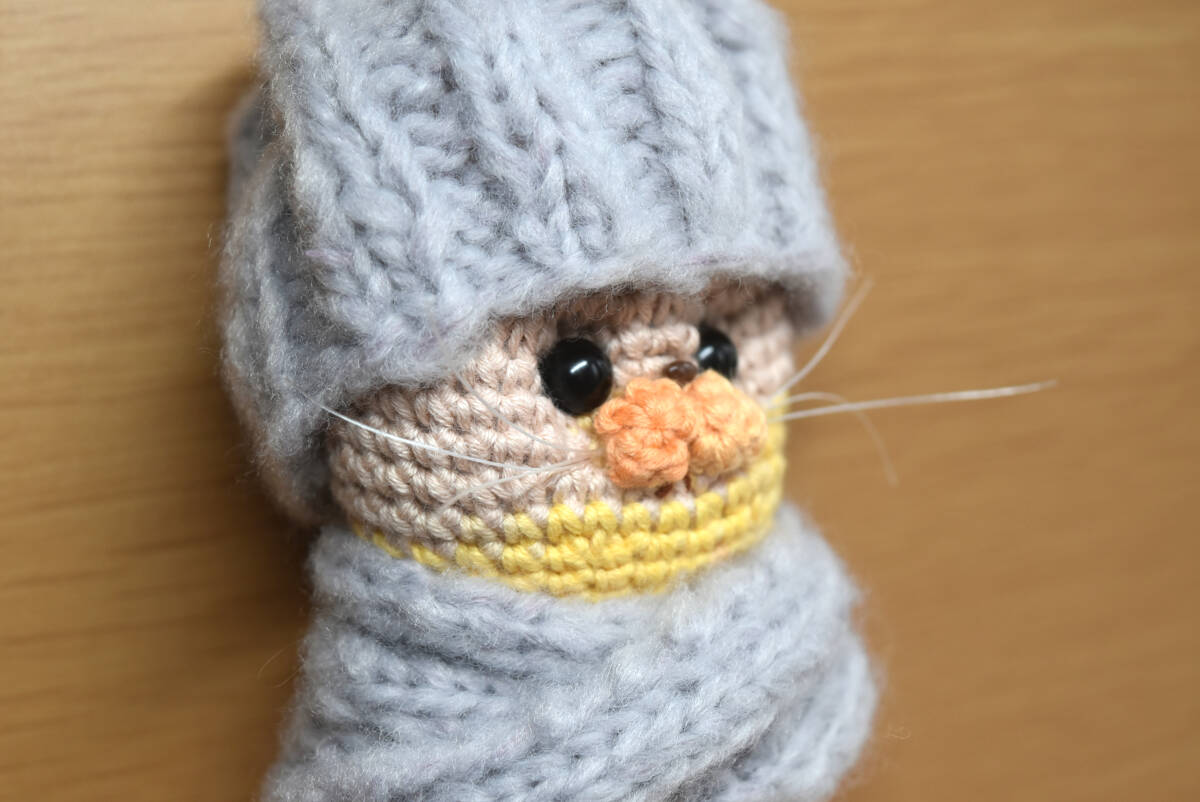 深めに被ったふんわりニット帽とお揃いのスヌードを装ったネコちゃんのあみぐるみです