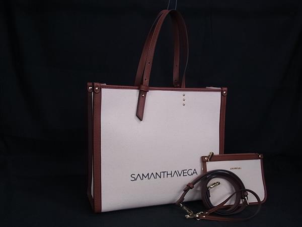 1円 ■美品■ Samantha Vega サマンサベガ キャンバス×レザー 2WAY ハンドバッグ トート ショルダー 斜め掛け アイボリー系 FU5481