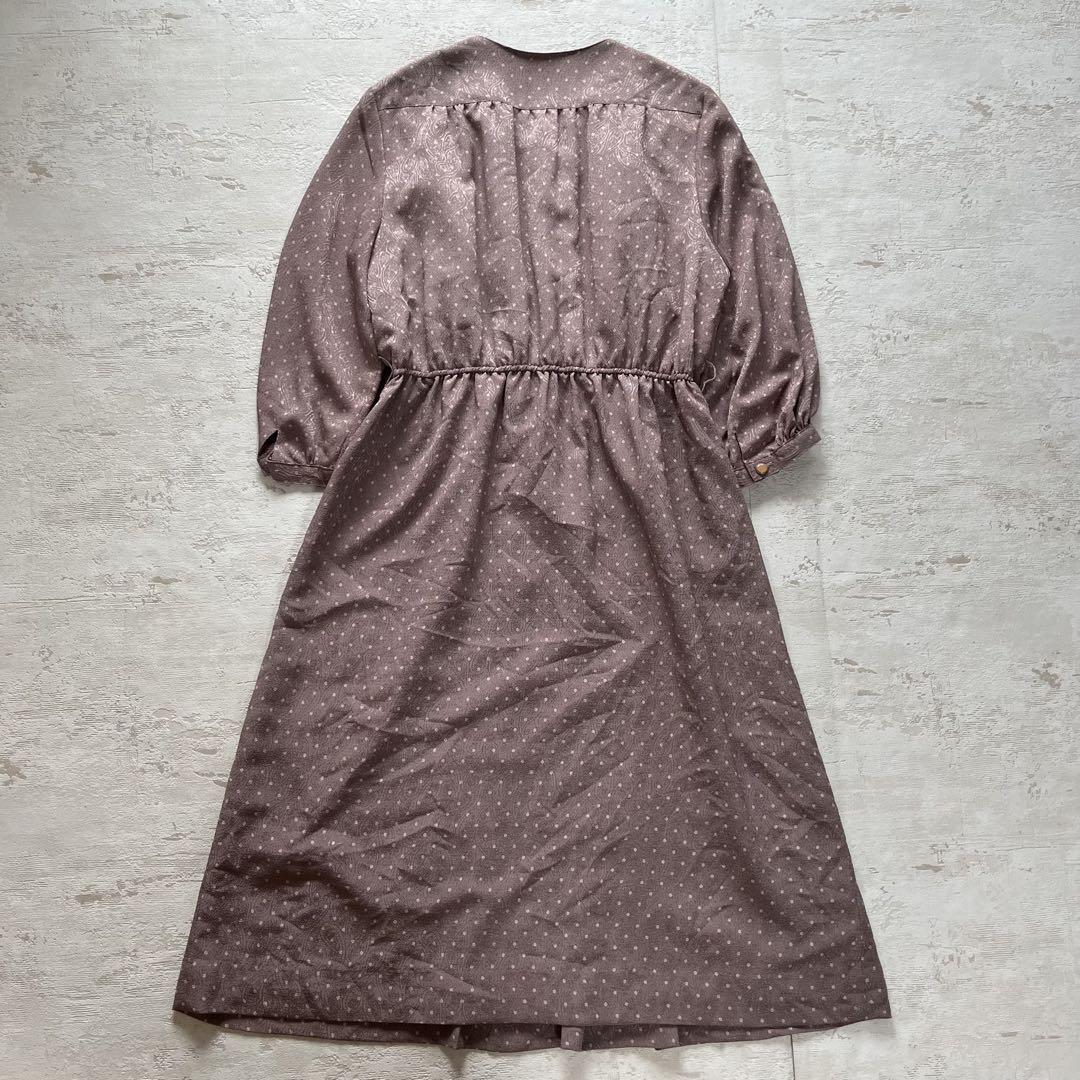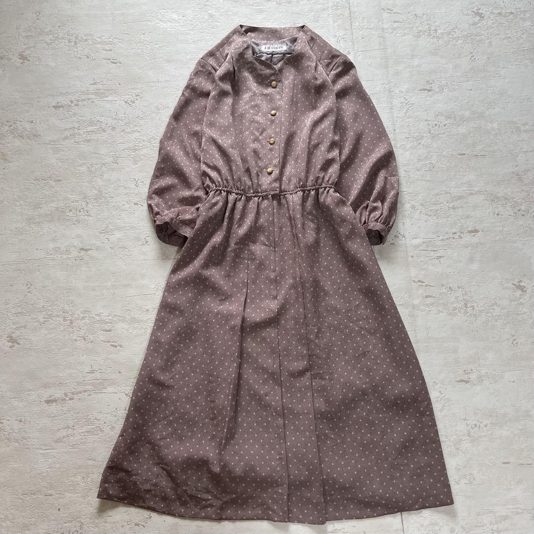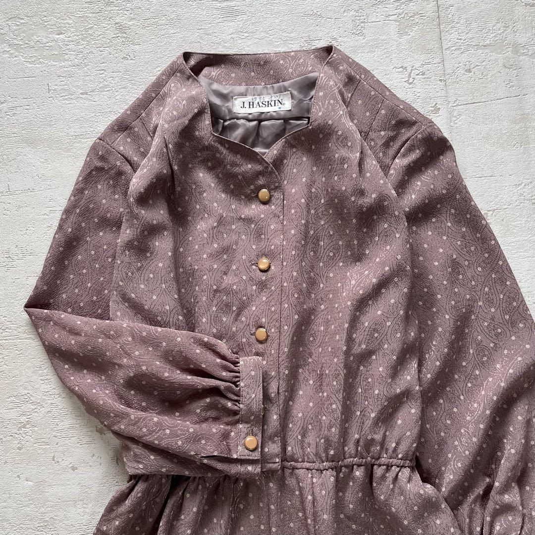 落ち着いたモーブピンクに小さなドットが散りばめられた、上品なレトロワンピース。