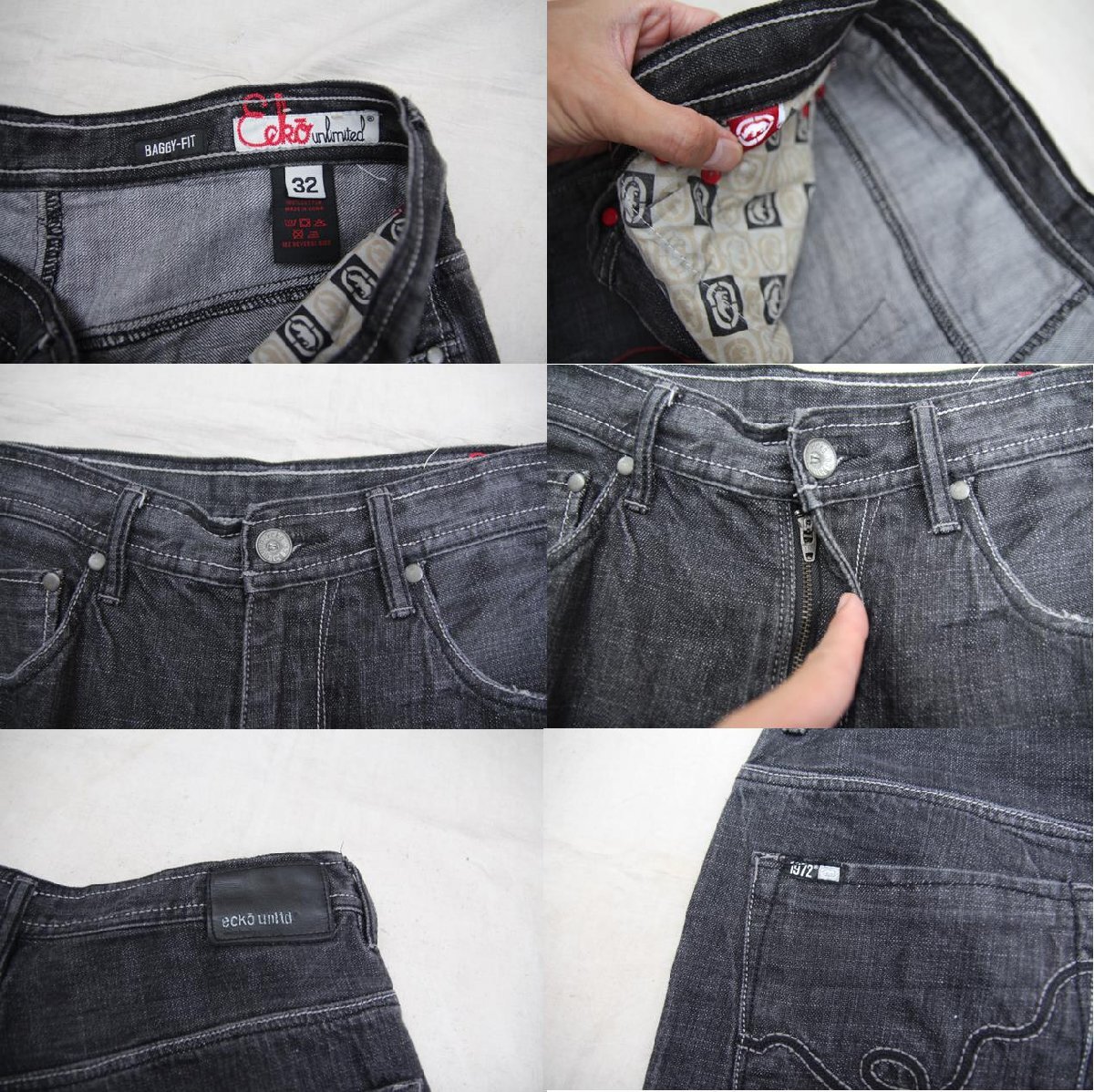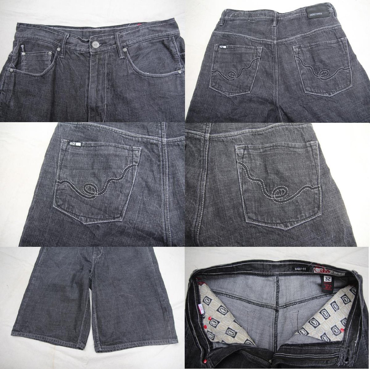 2000年初頭頃のEcko Unltd製のブラックデニムショーツとなります。1993年に設立されたアメリカスポーツカジュアルブランドとなります。主にストリート、ヒップホップファッション好きが好んで着用するブランドでサイのアイコンでも有名ですね。こちらのショーツもEckoらしくエッジの効いたデザインでバックポケットのステッチ刺繍、ポケット裏地の総柄デザインとなり、綺麗な縦落ち加工も施され、バギーフィットらしいワイドで膝下丈な点もお好きな方が多いかと思います。探されている方も多いブラックデニムショーツですので是非ご検討下さい。