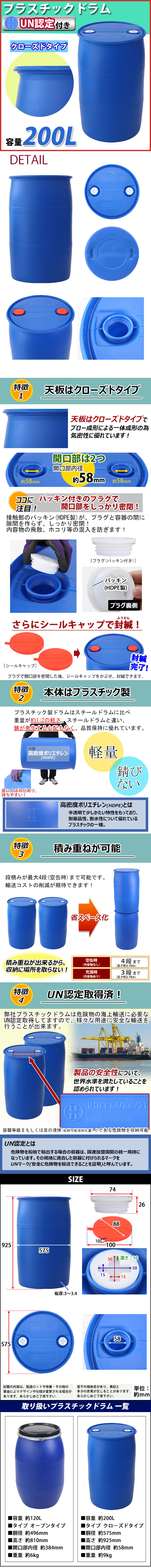 | 商品名 | 送料無料 ドラム缶 プラスチックドラム UN認定付き 200L クローズドタイプ 1個 クローズ プラドラム プラスチックドラム缶 雨水タンク 輸送容器 プラグ 運搬 運送 薬剤 貯水 物流 保管 危険物 海上輸送 液体 薬品 溶液 密閉 密封 高密度ポリエチレン HDPE ブルー pdrum200lc |