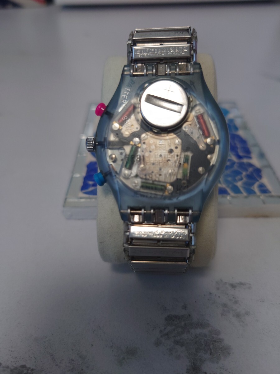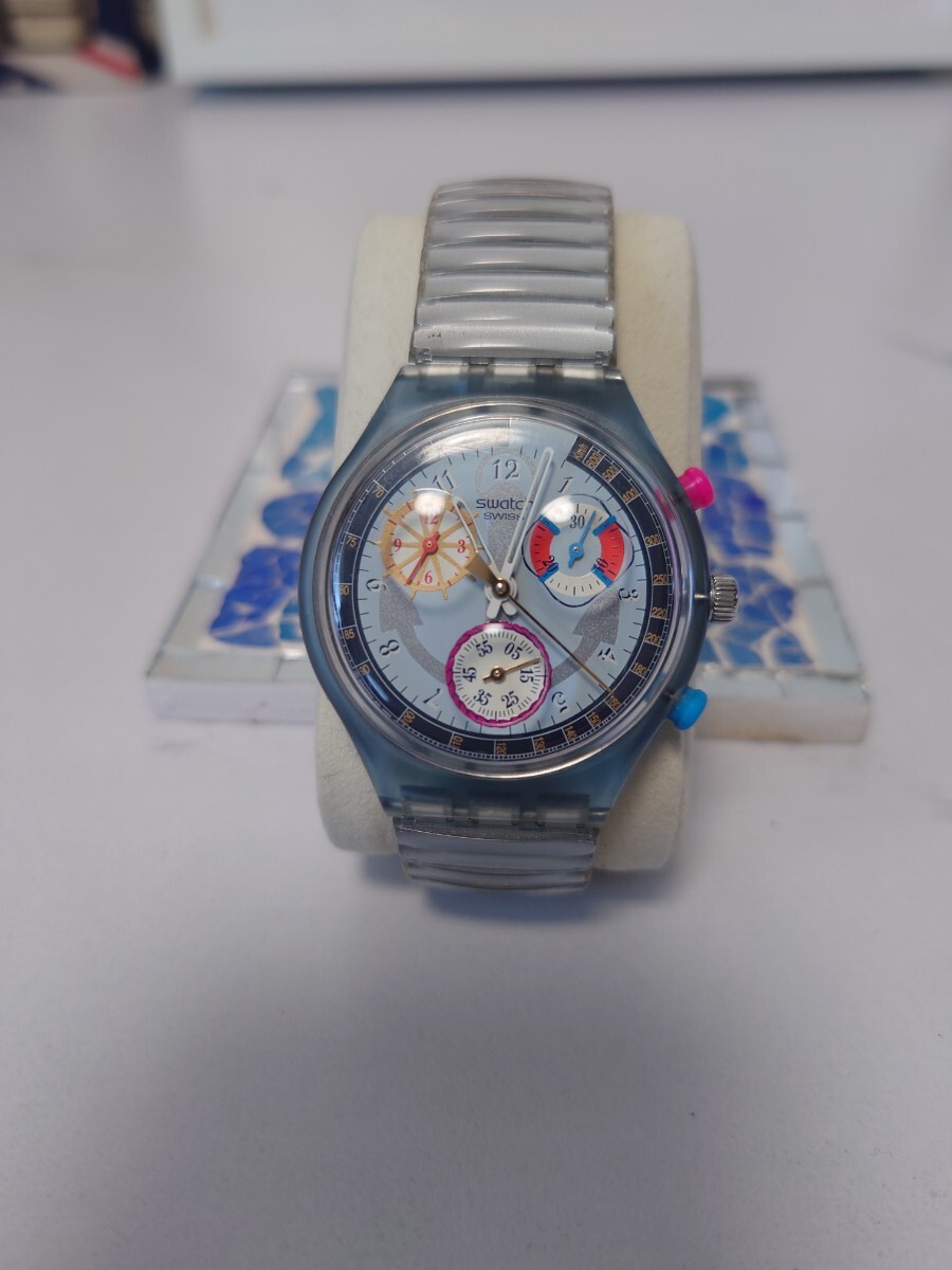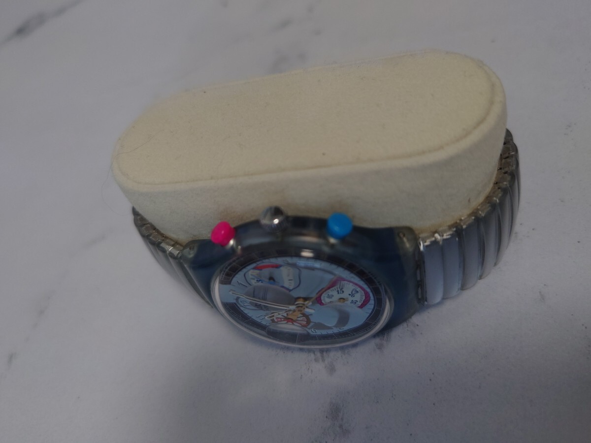 スウォッチの「クロノ パワー スチール SCN110」です。このモデルは、1990年代に販売された初期のクロノグラフシリーズのひとつで、1994年のモデルとされています。