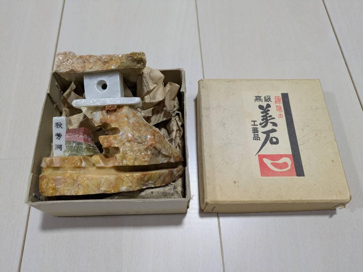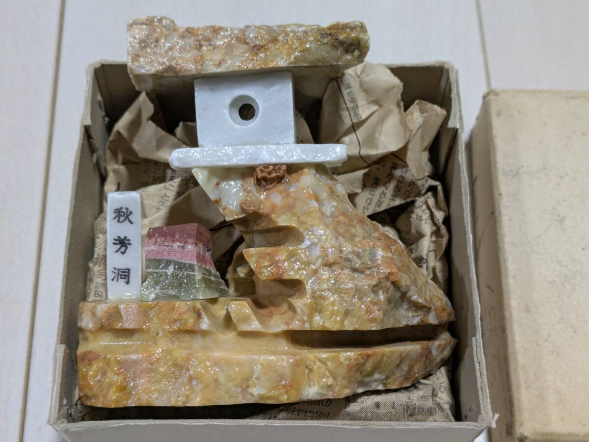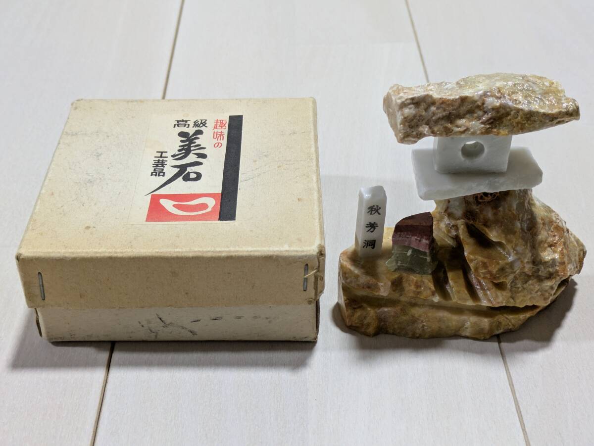 秋芳洞 美石 置物 石 燈籠風 年代物 昭和 レトロ オブジェ アンティーク 元箱有