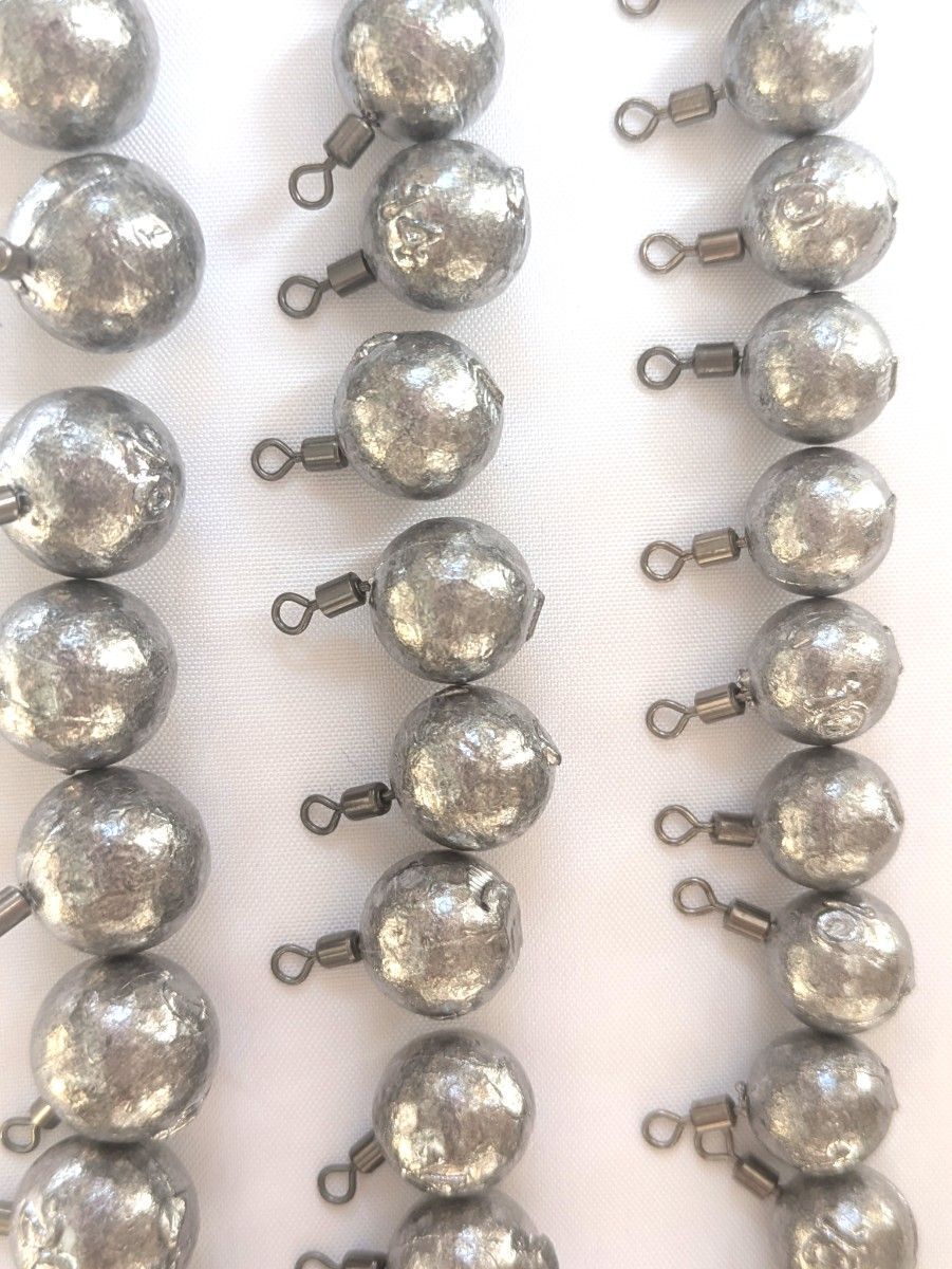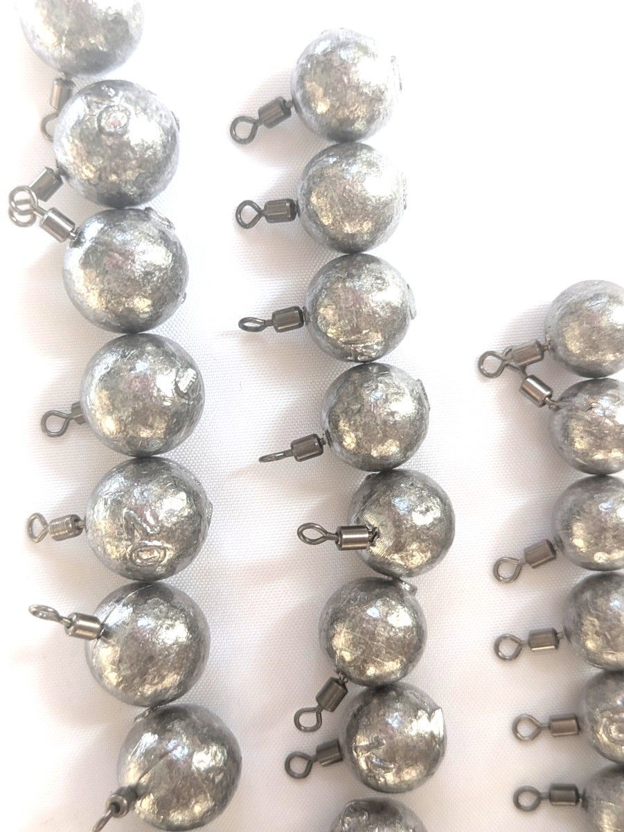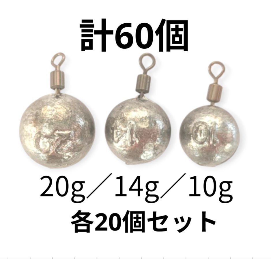 スイベル(サルカン)付きの丸型鉛シンカー、10g・14g・20gの3種類を各20個ずつセットにしました。