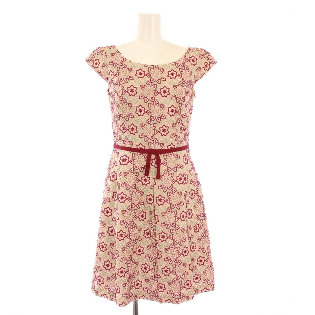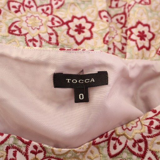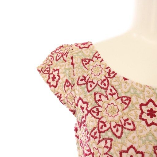 トッカ TOCCA フレアワンピース ひざ丈 半袖 クルーネック 花柄 刺繍 0 ピンク 赤 レッド ベージュ /BB レディース
