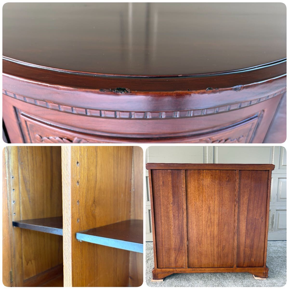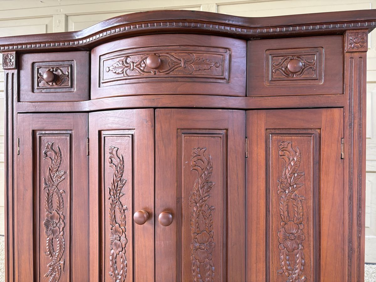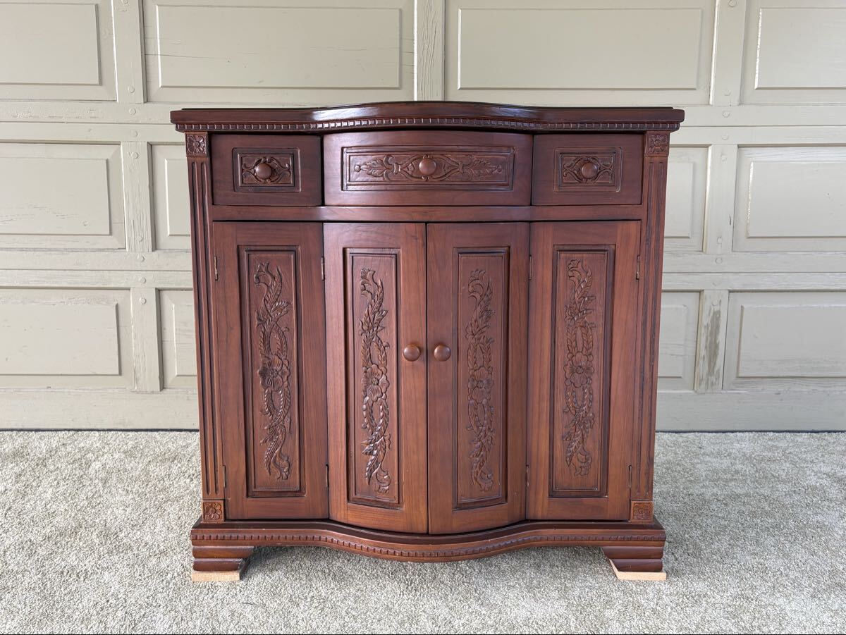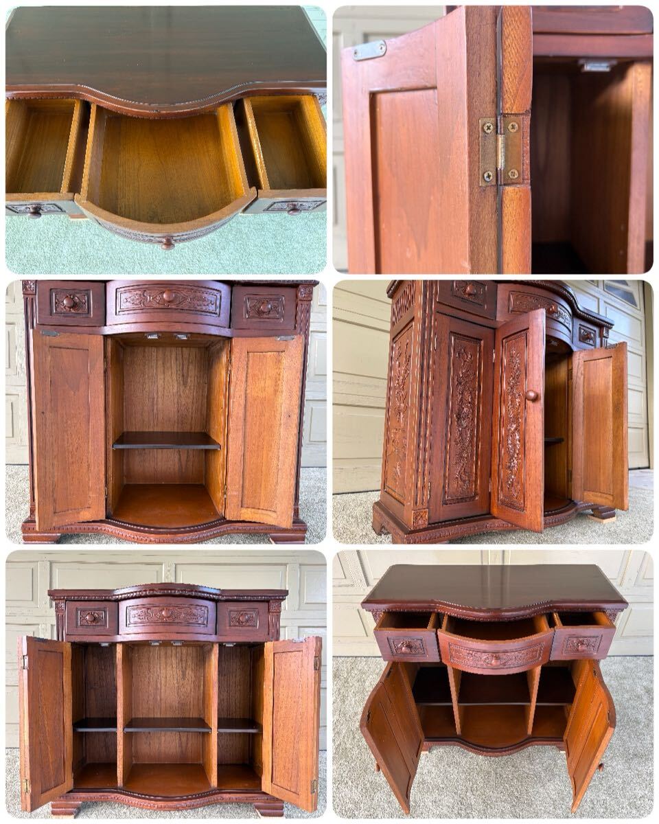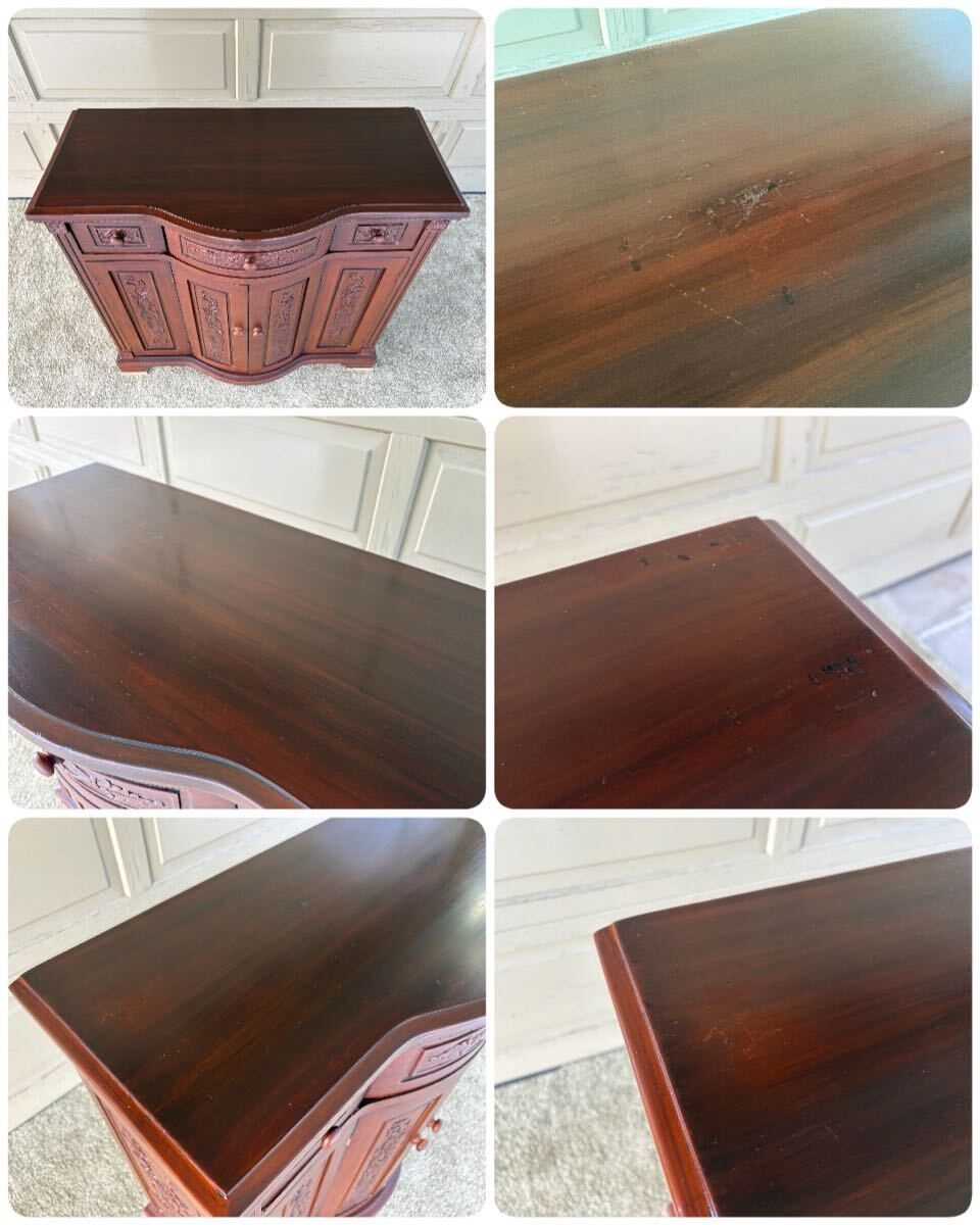アンティーク調 木彫りコンソールキャビネット サイドボード 飾り棚 中古 天板ヘコミ