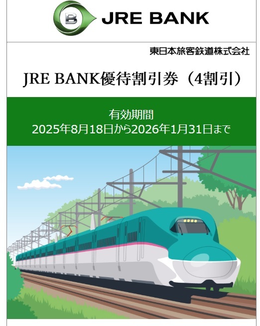 JRE BANK 優待割引券(4割引)1枚 2026年1月31日まで有効 取引ナビにて通知