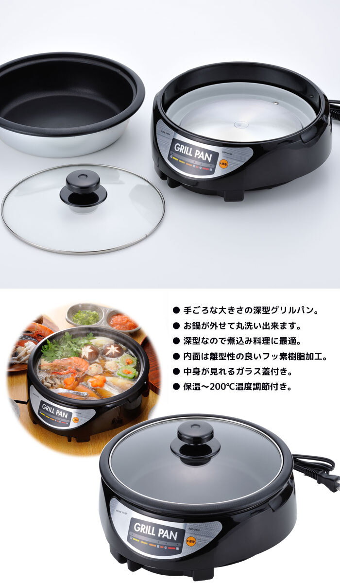 | 手ごろな大きさの深型グリルパン。 お鍋が外せて丸洗い出来ます。 深型なので煮込み料理に最適。 内面は離型性の良いフッ素樹脂加工。 中身が見れるガラス蓋付き。 保温~200℃温度調節付き。 |