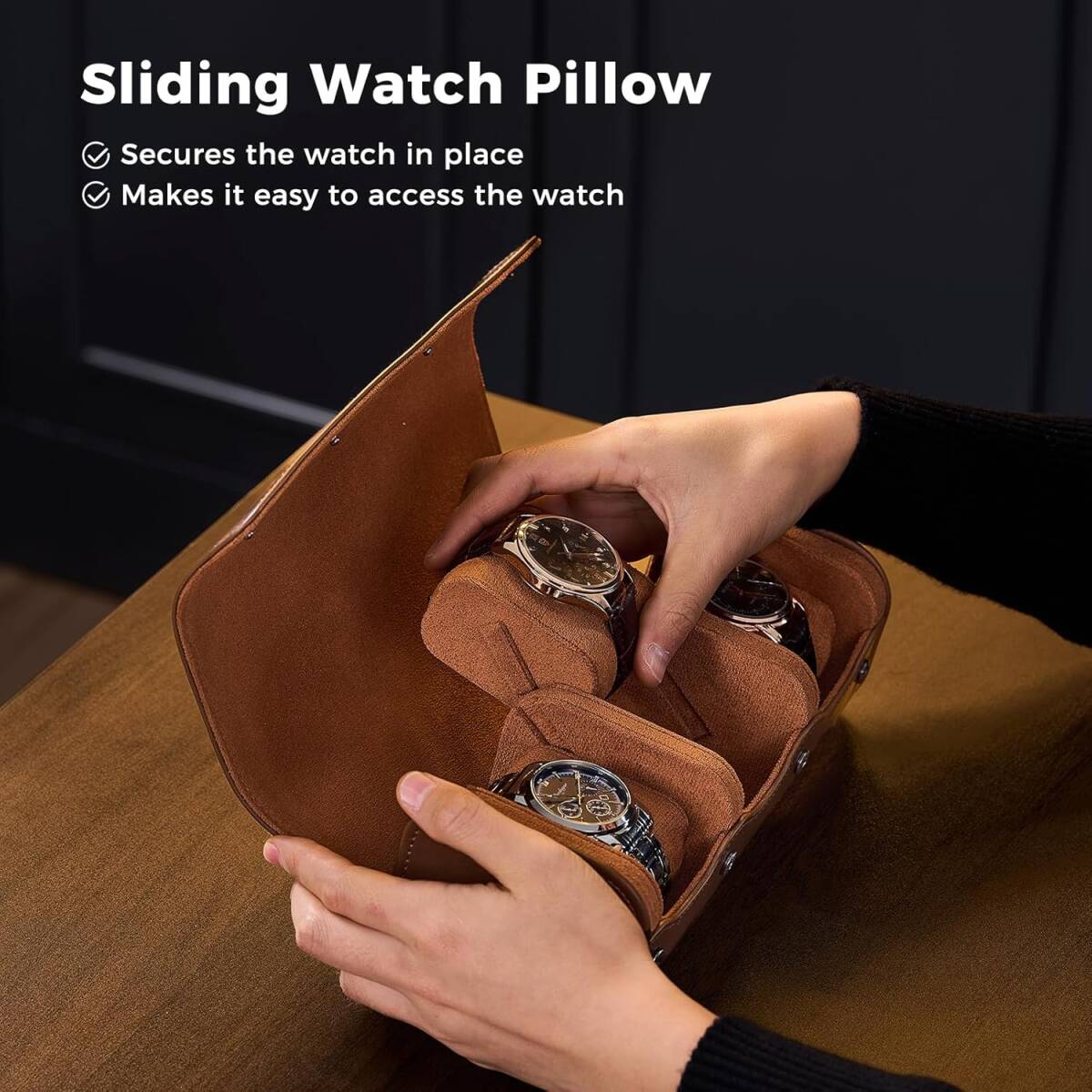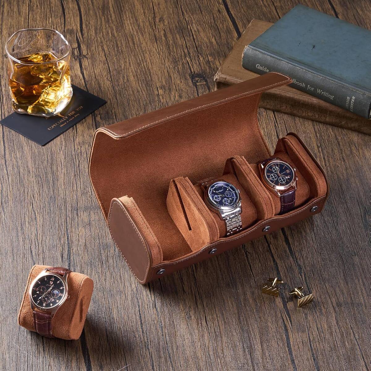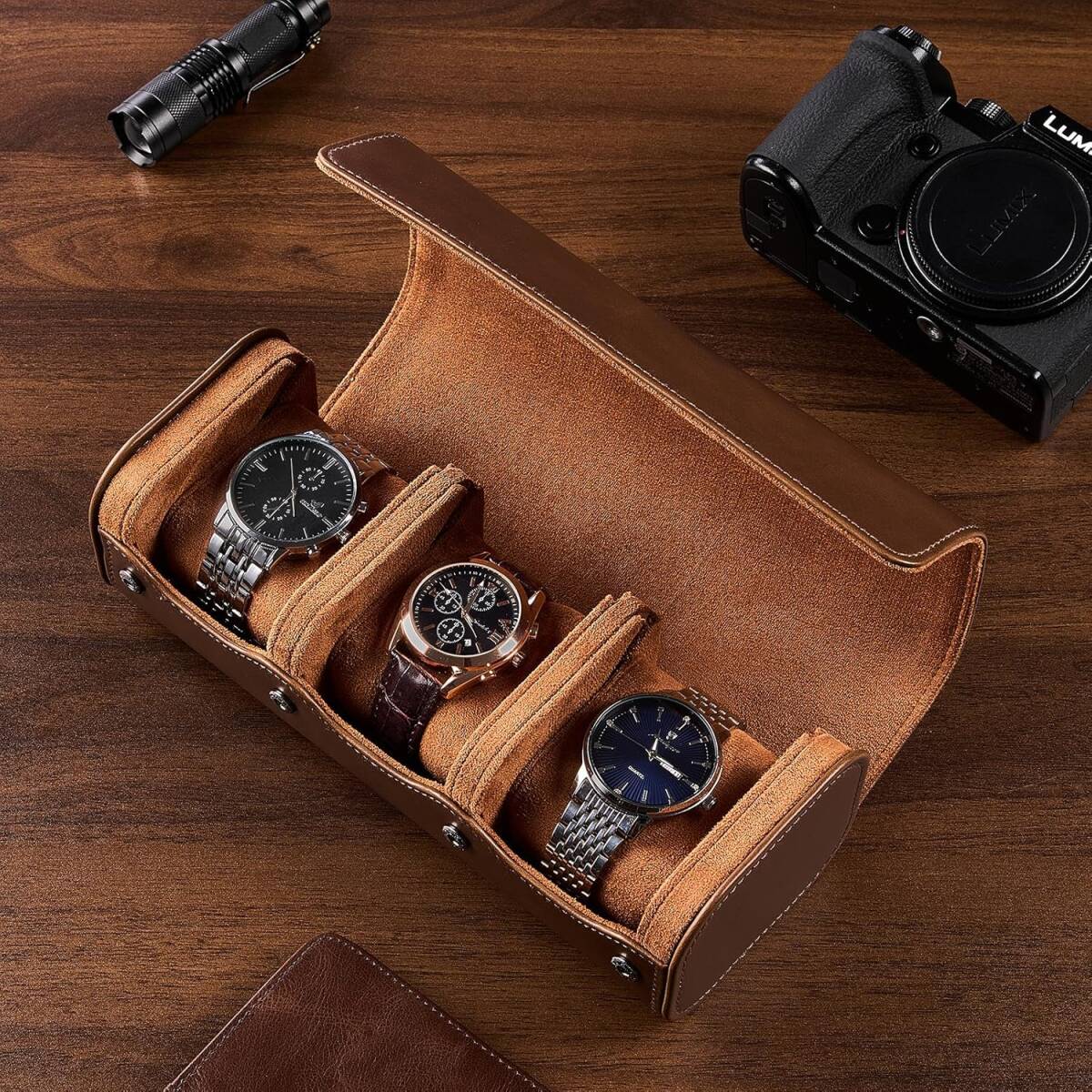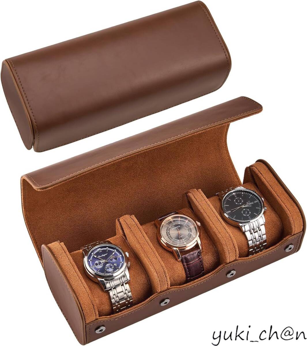腕時計収納ケース 3本用 トラベルウォッチケース PUレザー ブラウン 高級スエード調 保護クッション付き ブラウン ギフト