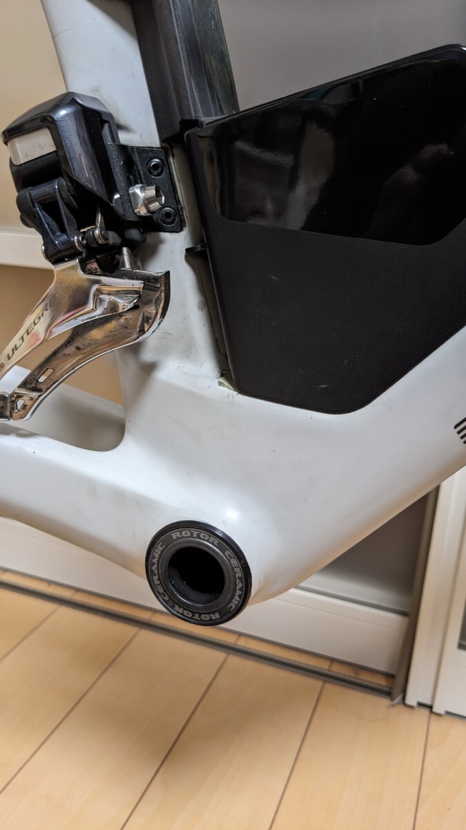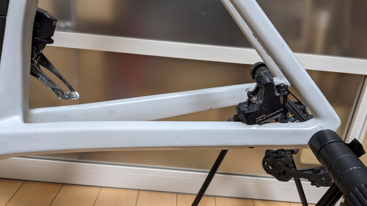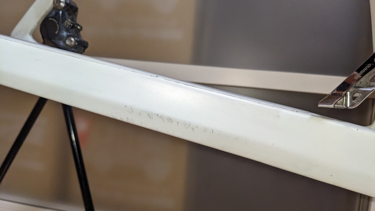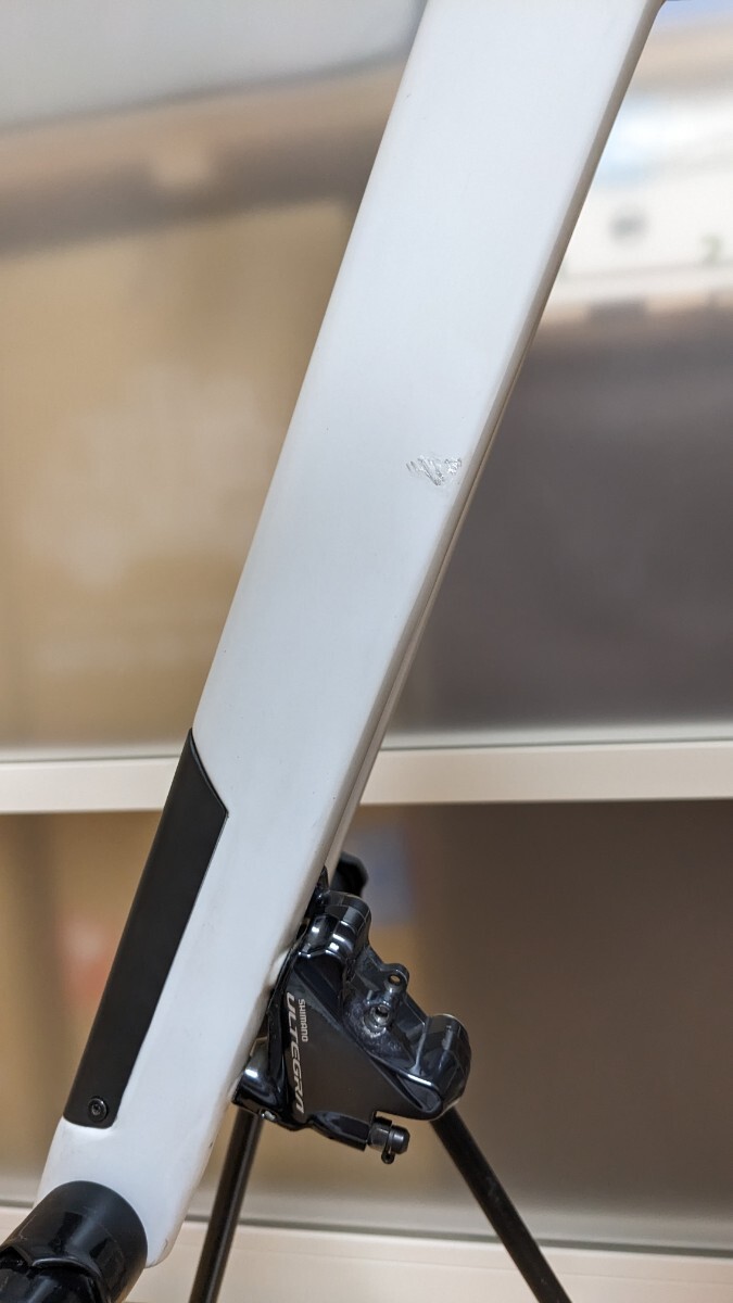 空力も良く脚あたりも優しいのでロングライドでかなり楽をすることができました。落車はないですが写真撮影時に倒れてフロントフォークに小さな傷、チェーン落ちした際にチェーンステーに傷があります。写真をご確認ください。また、BB上のストレージの表面の合皮が経年劣化でボロボロになってきていますが使用に問題ありません。