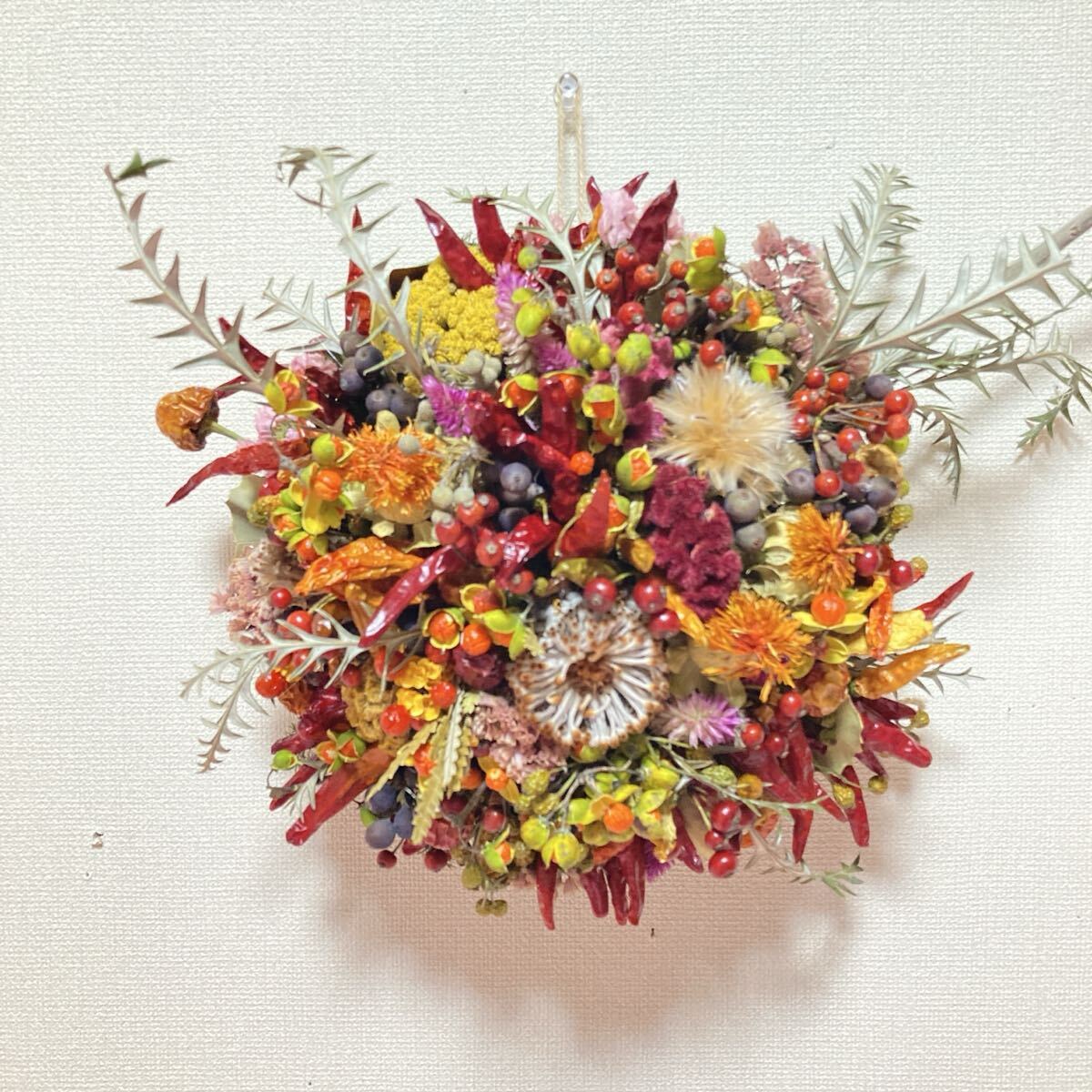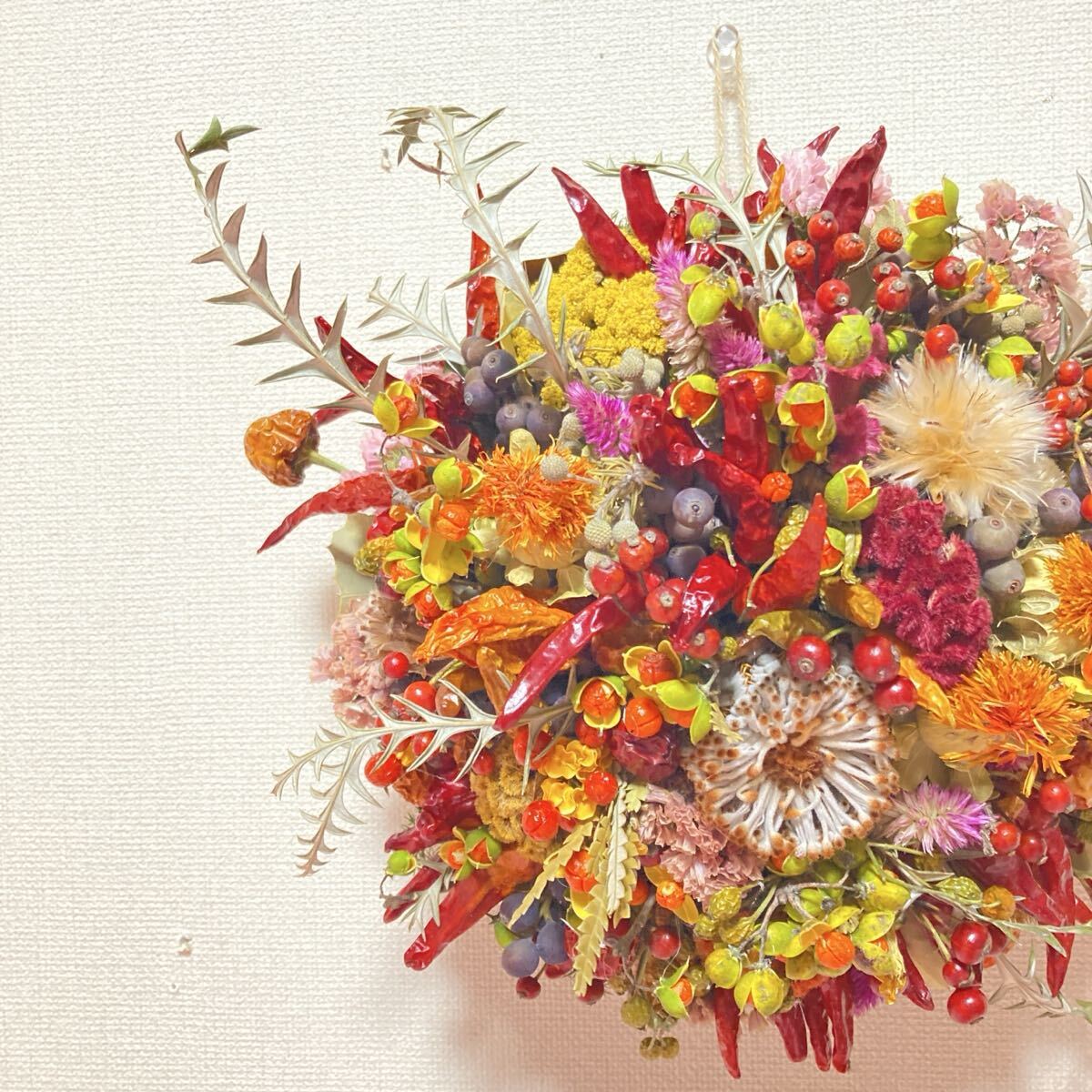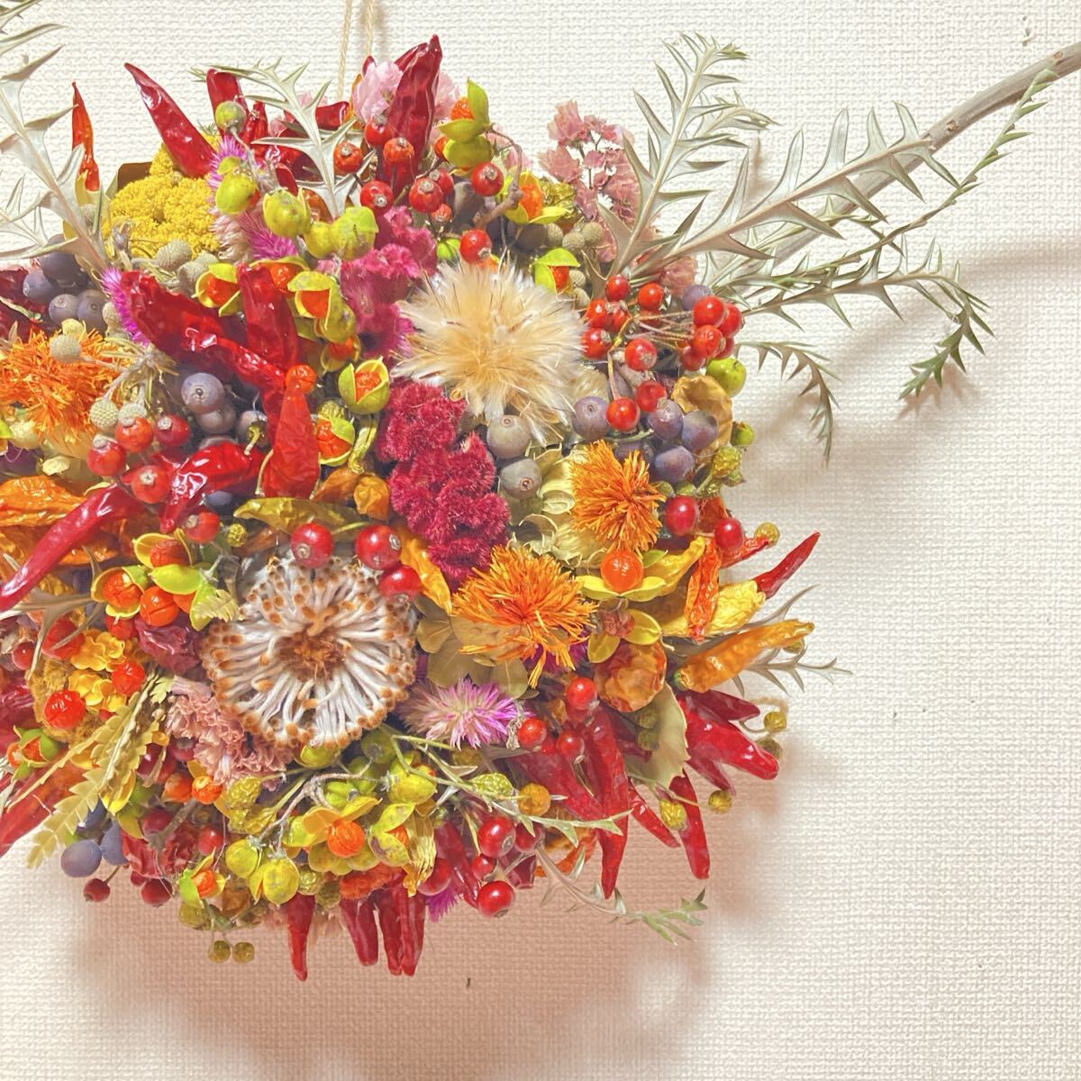 ケイトウとトウガラシをメインに鮮やかな花材でリースをアレンジしました。