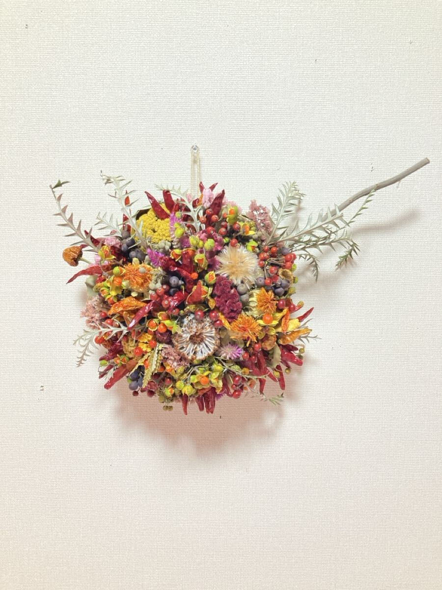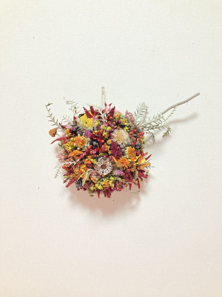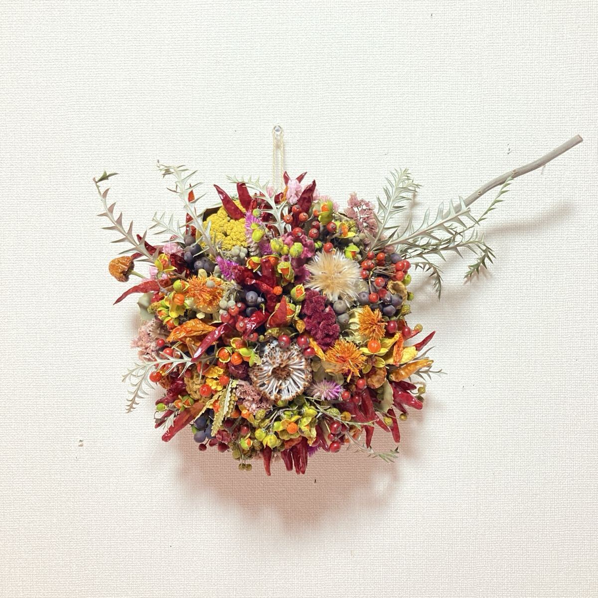 ケイトウとトウガラシをメインに鮮やかな花材でリースをアレンジしました。