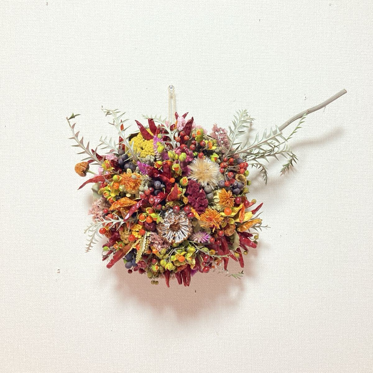 ケイトウ、トウガラシ、野バラの実、シャリンバイ、ツルウメモドキ、紅花、バンクシアコクニシア、プルニア、プルモサ、ドライアンドラ、千日紅、グレビレアゴールド、グレビレアアイバンホー。