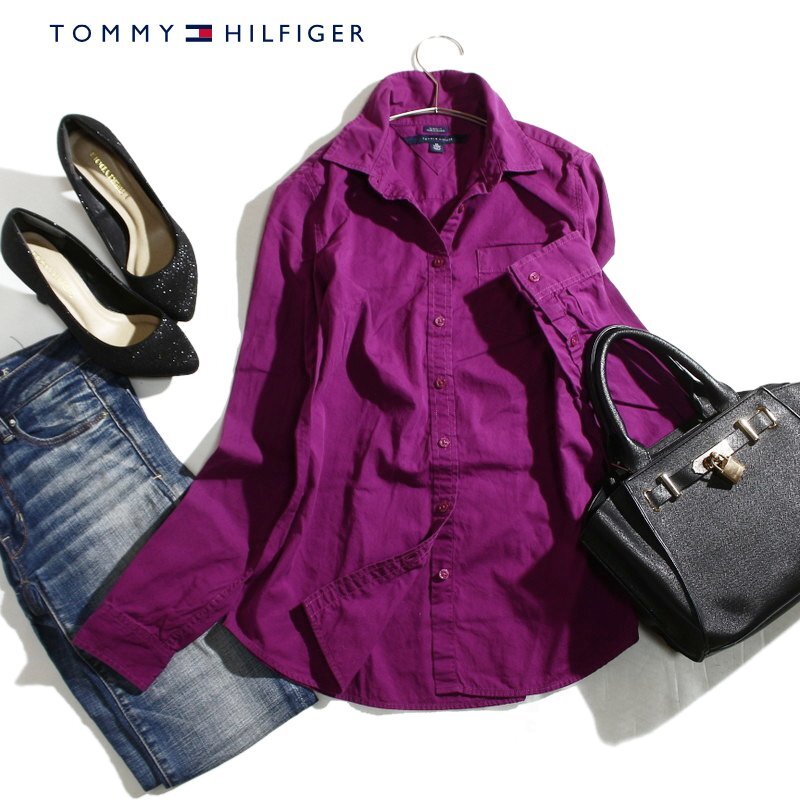 美品 トミーヒルフィガー TOMMY HILFIGER ロゴ刺繍 長袖シャツ パープル 紫 XS TP/XP レディース カジュアル ストレッチ 正規 秋 春 通年