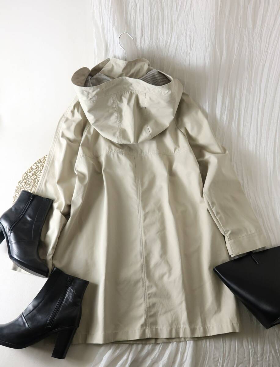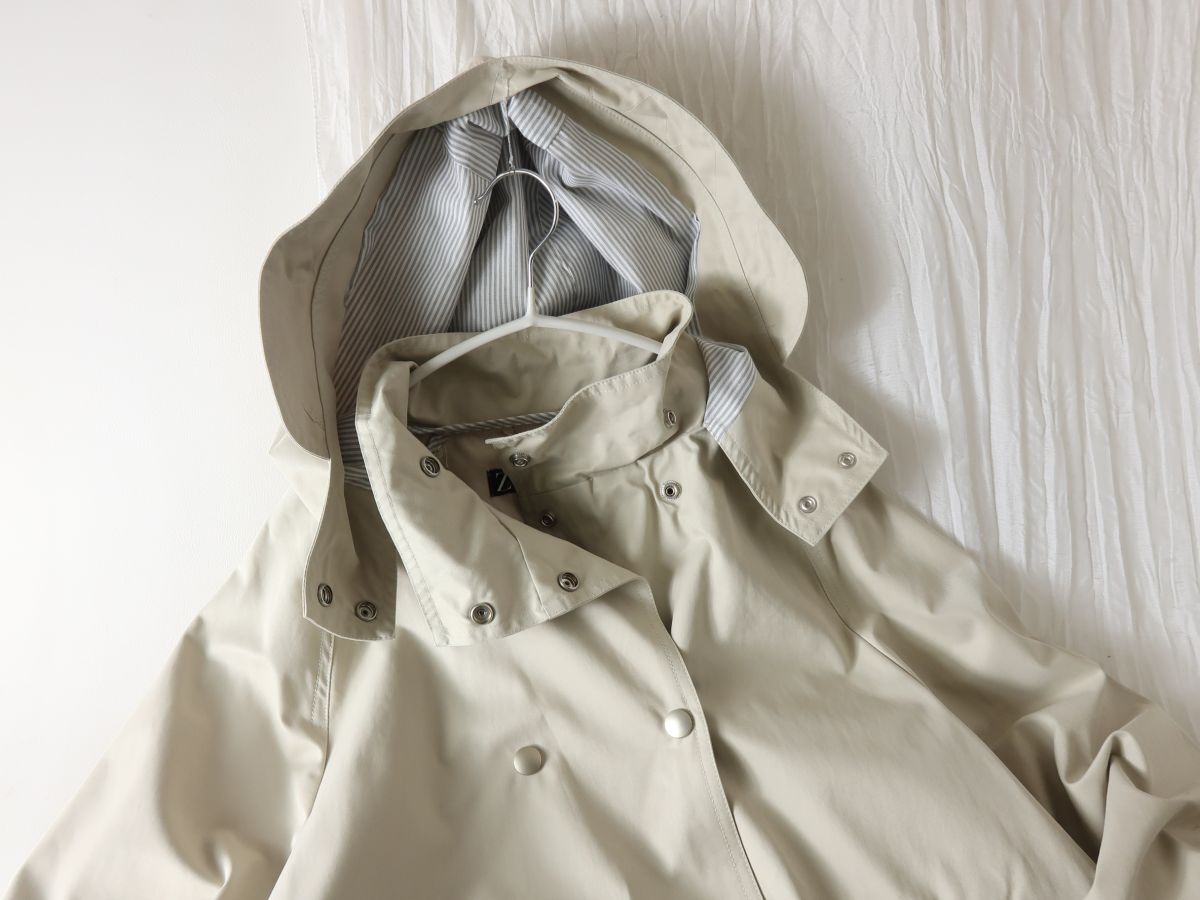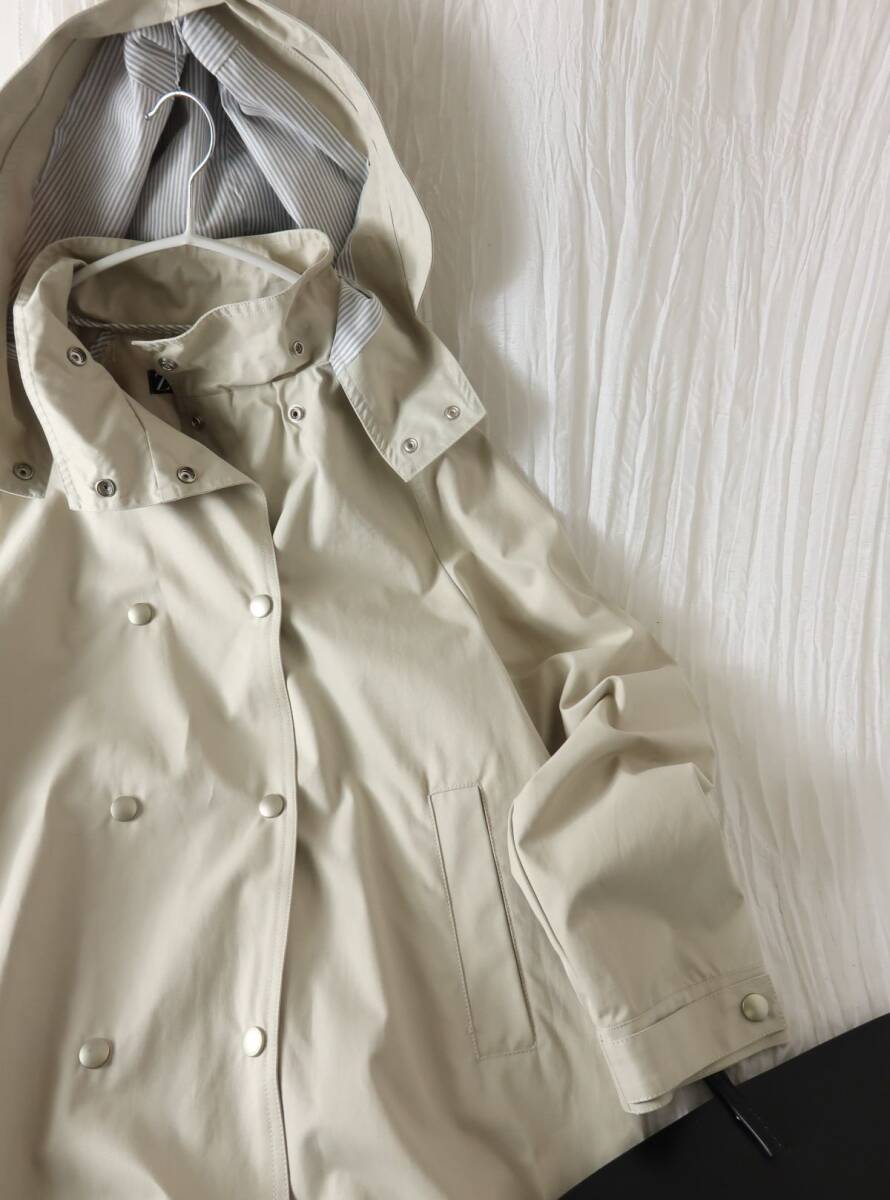 襟が高めのハイカラーで、気温の低い雨の日でも首元が冷えないのが優秀ポイント。
