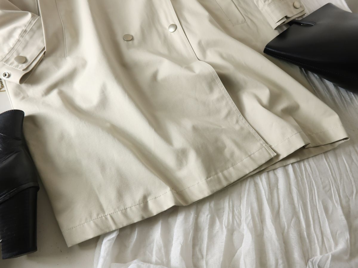 機能的なのにおしゃれなシルエットで、裏地もさりげなくストライプ柄になっているなど、気分が上がる一枚です。