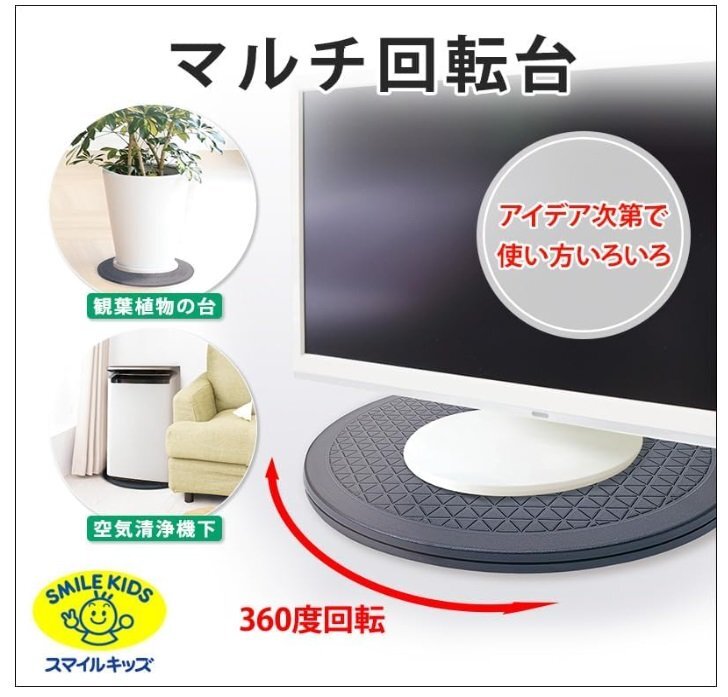 ・指1本でらくに左右回転できます。 ・物を載せる上面に滑り止めゴムを配置してありますので、回転中に載せた物が滑らないようになって安全に使用できます。 ■商品説明 ・軽い力でテレビの向きを変えられる回転台です。対応テレビは20インチまでです。 ・耐荷重が100kgですので頻繁に向きを変えるスピーカー置きや、台所で調味料置きにも重宝されています。 ・テレビ、パソコンモニターなどのディスプレイ、タブレット、電話機、キッチン下など多用途でお使いいただけます。 |