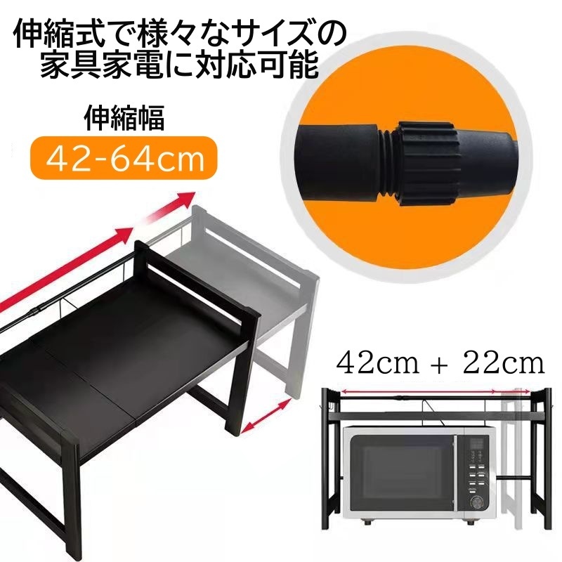 ・幅42-64cmの幅広い調整範囲で、トースターや炊飯器、電子レンジなどのキッチンアプライアンスをスッキリと収納できます。