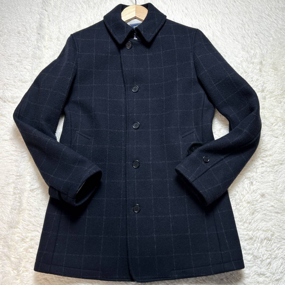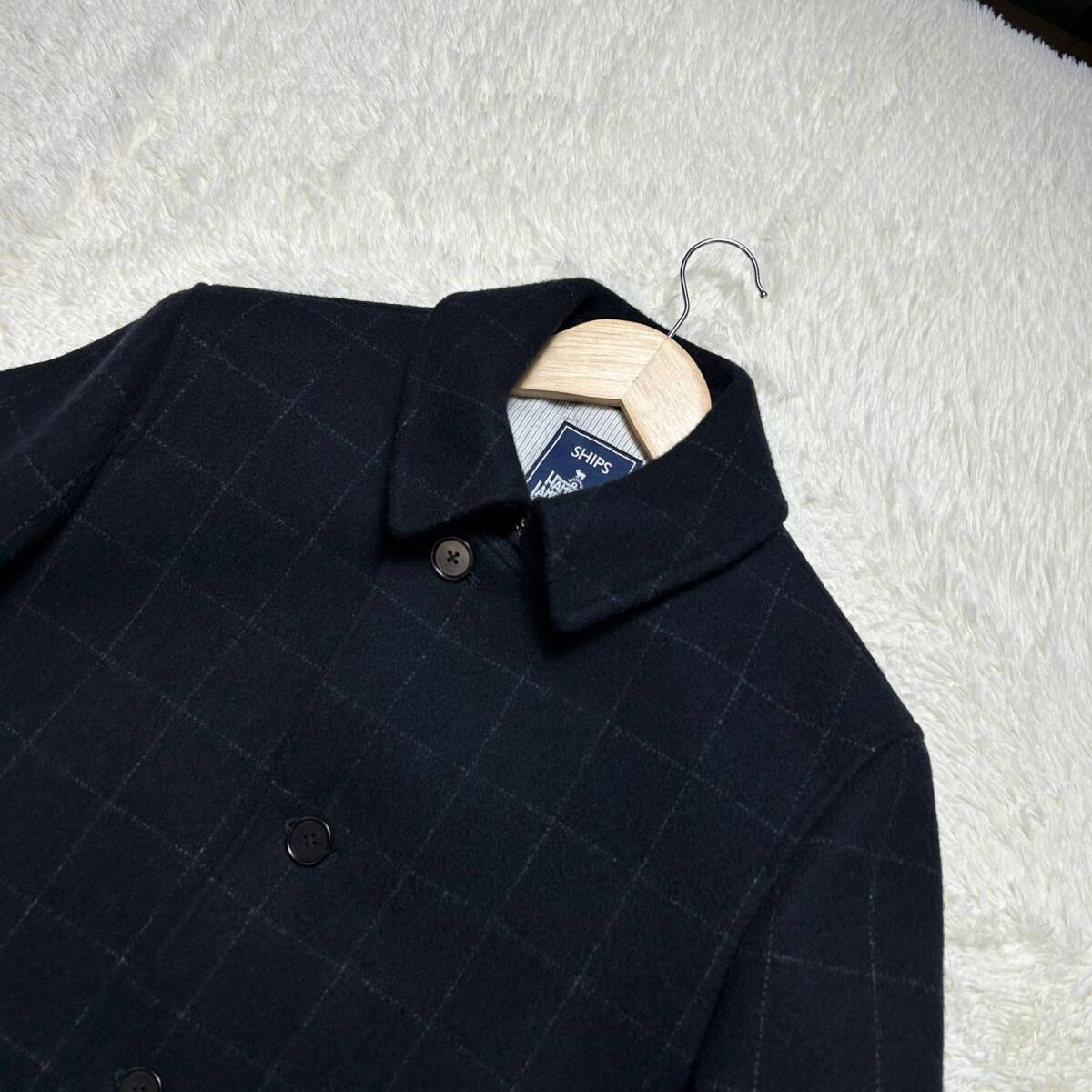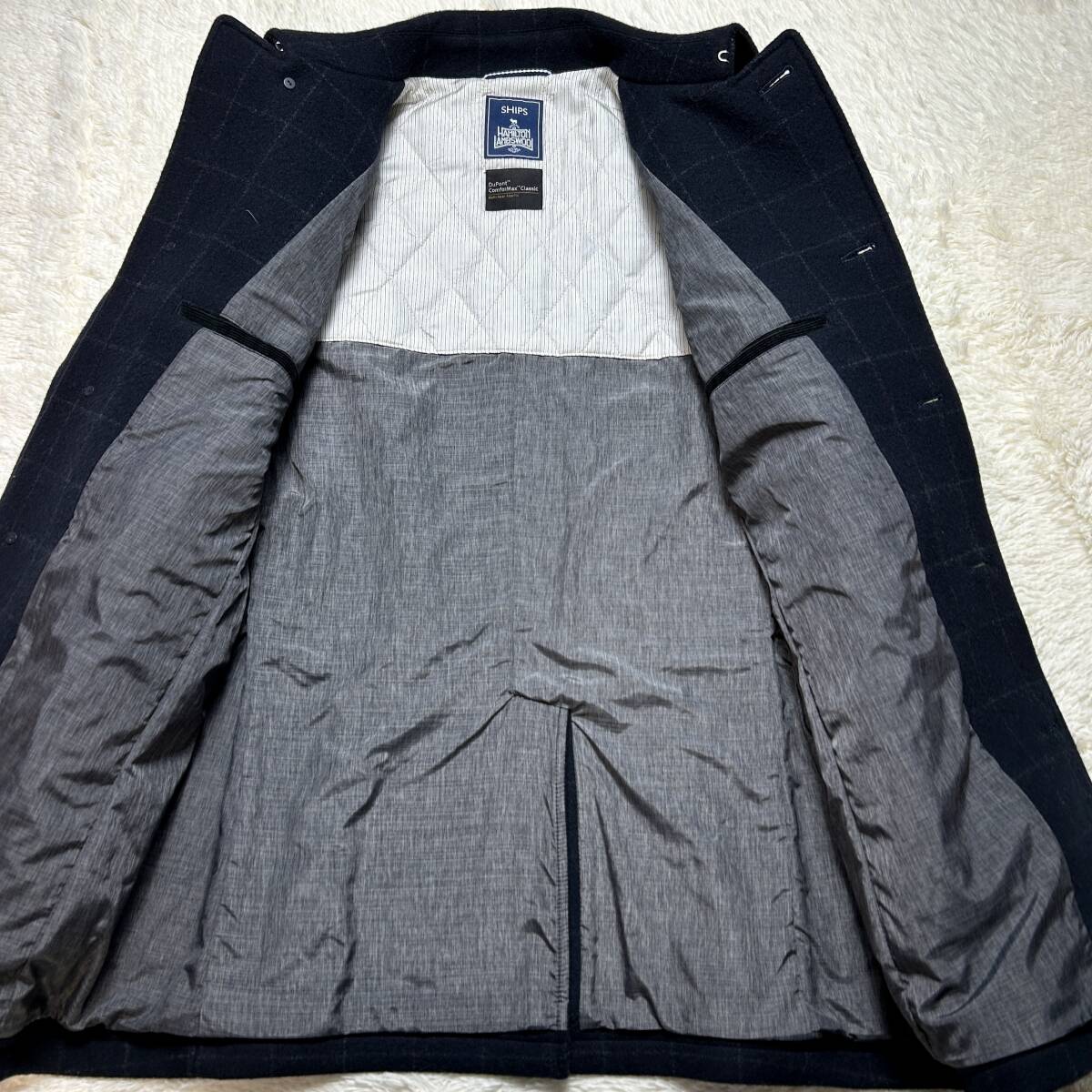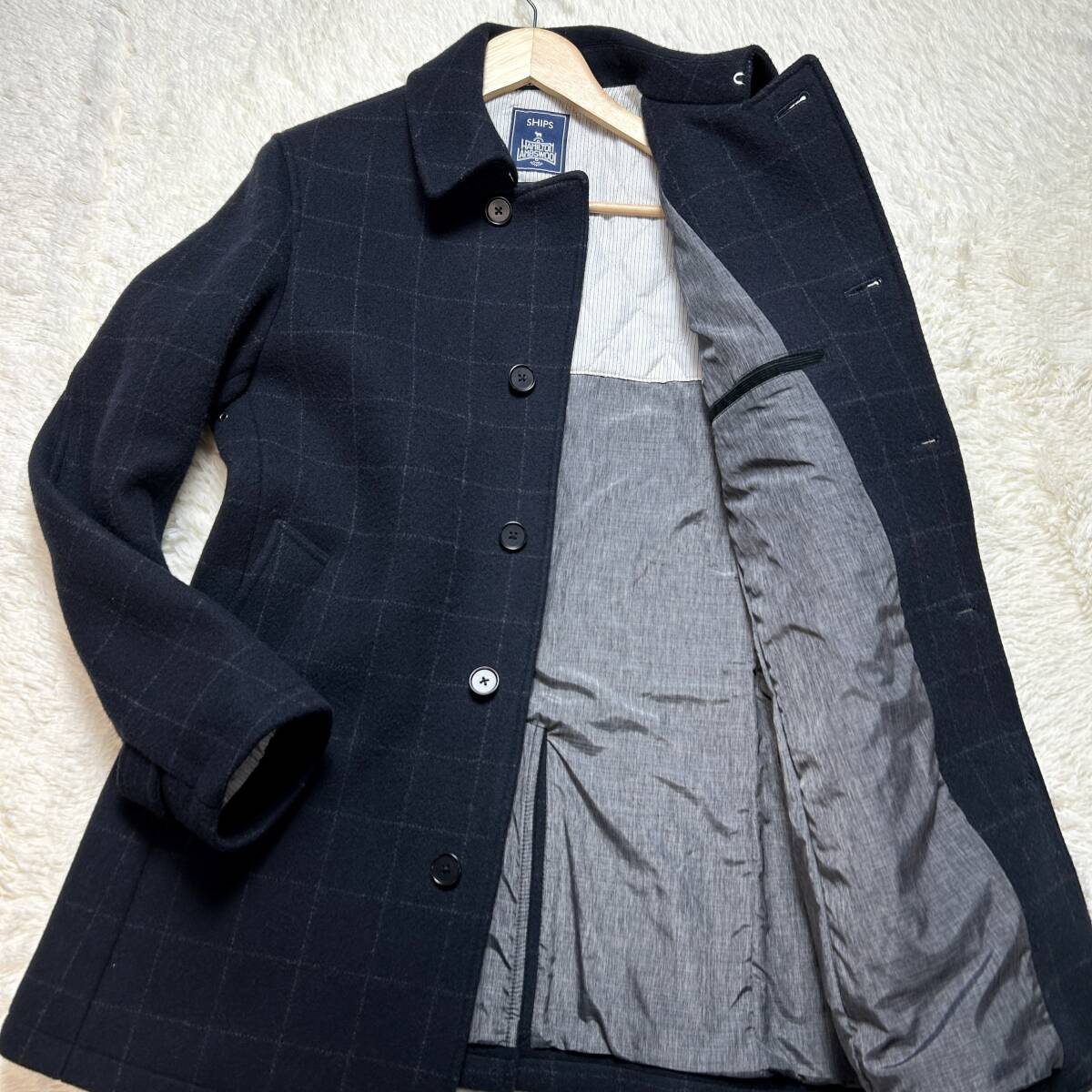極美品/極上ハミルトンウール/L◎SHIPS シップス ステンカラーコート チェック柄 シルク混 ダークネイビー メンズ カジュアル アウター