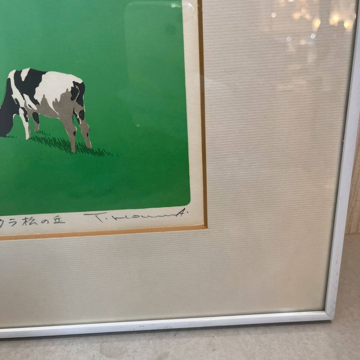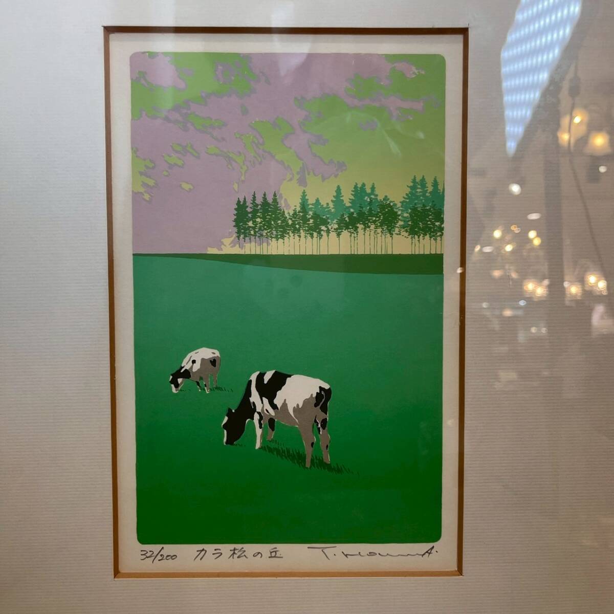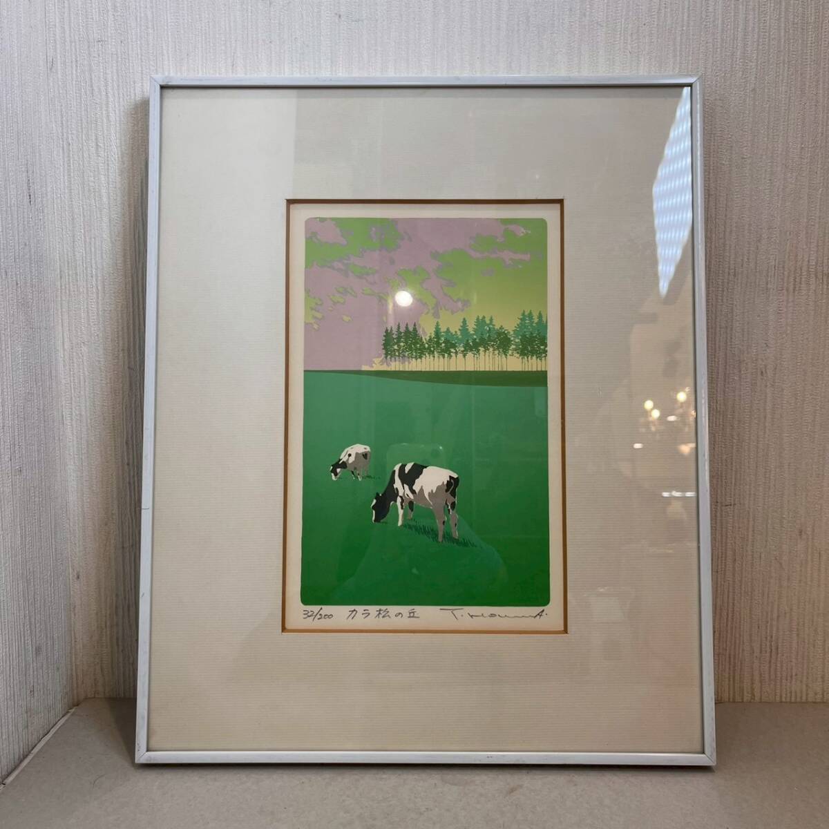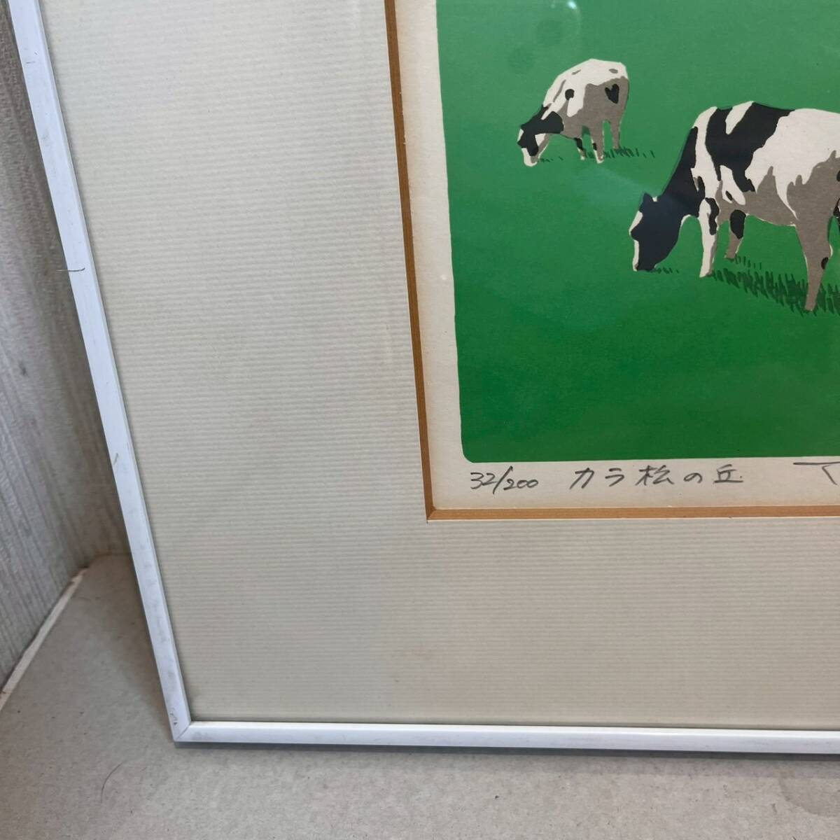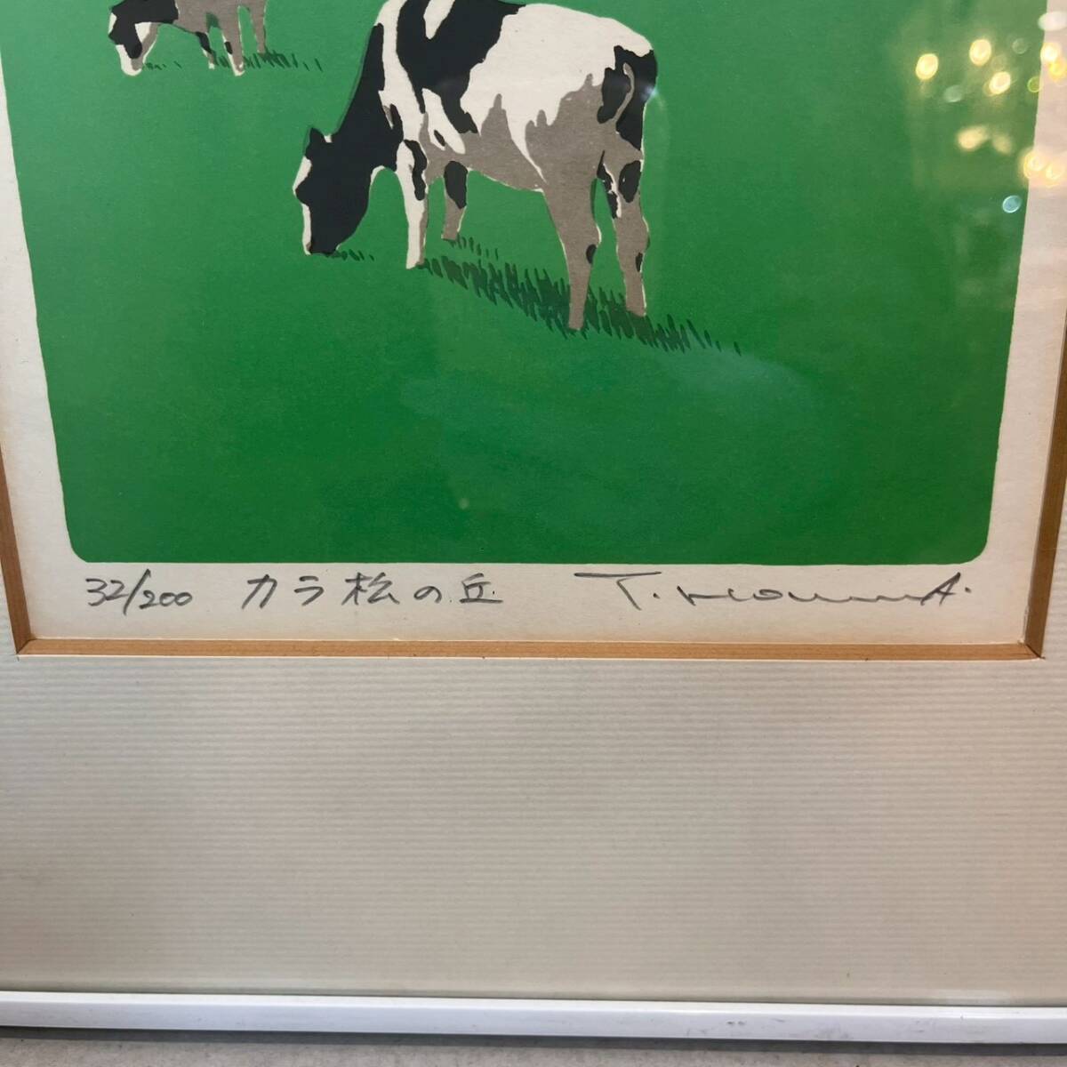 【 真作 】 本間武男 シルクスクリーン カラ松の丘 32/200 牧場 牛 版画 油絵 絵画 額装 額縁 ナンバリング サイン 美術品 風景画