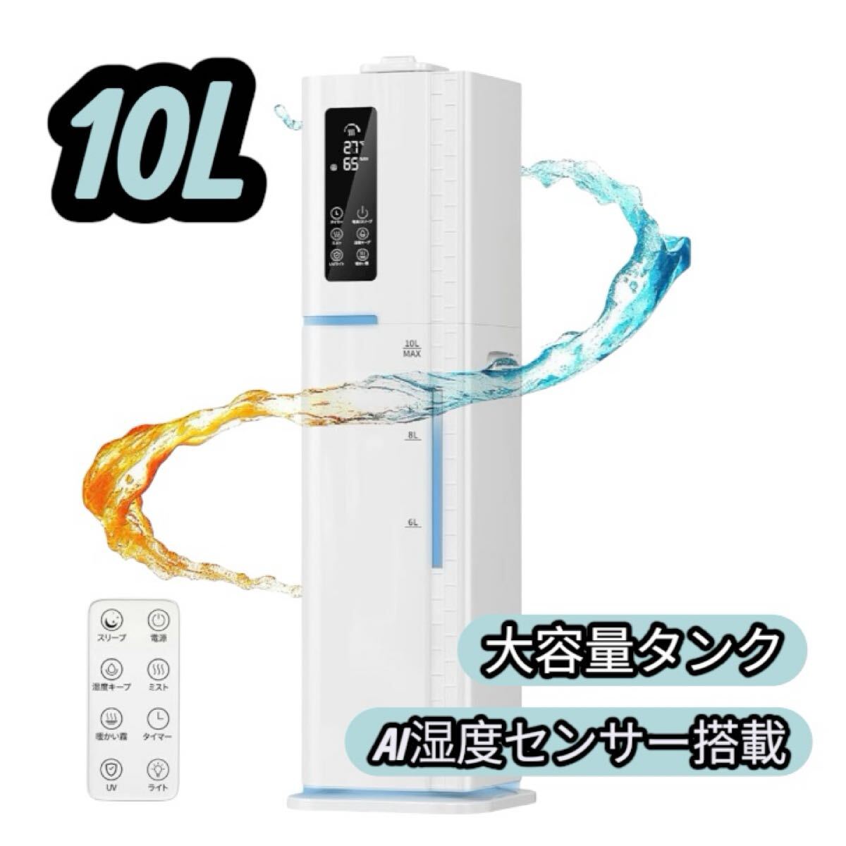上部から直接注水できるタンク一体型タイプ。フタを開けるだけで給水できるため、タンクを持ち運ぶ手間や水漏れの心配がありません。10Lの大容量で長時間の加湿が可能。弱モードでは最大約30時間連続運転でき、こまめな水補充が不要です。
