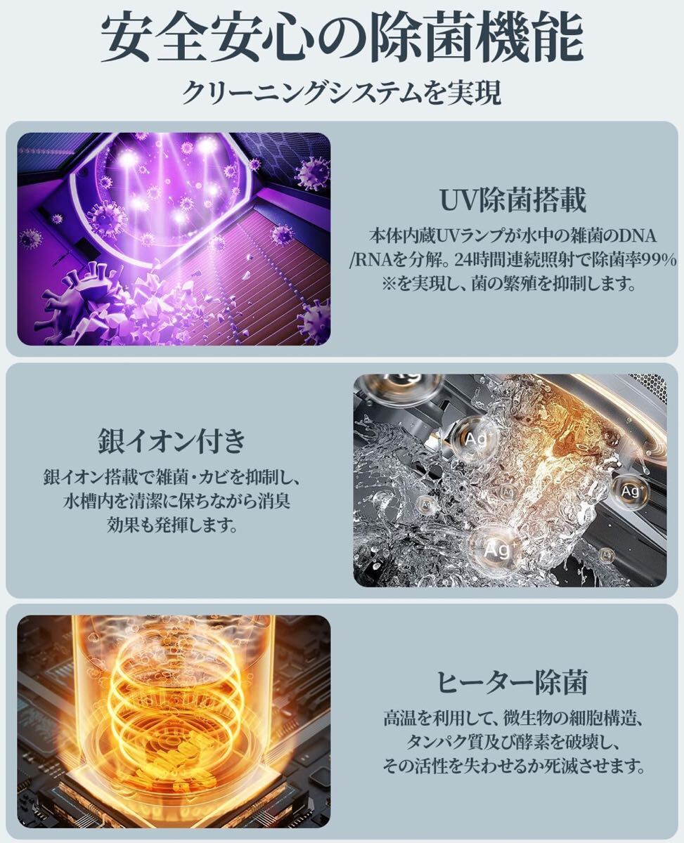 ◎除菌機能:UVライト搭載/麦飯石フィルター内蔵