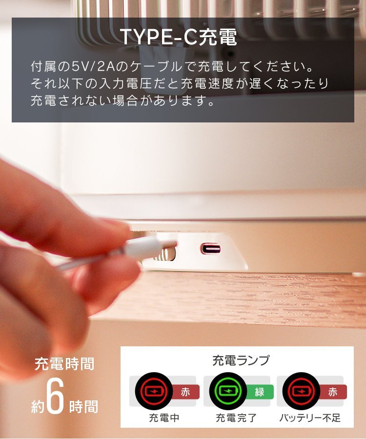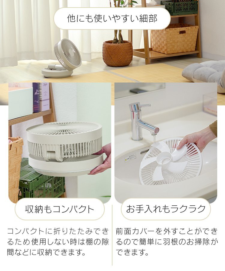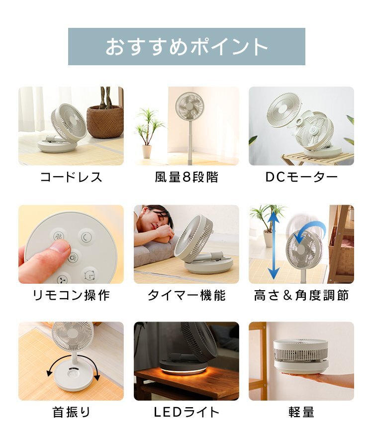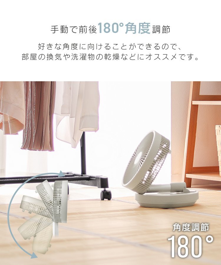 コンセント不要でどこでも使える!リモコン付き 折りたたみ式扇風機です。 ■角度・風量を自由自在に調節! 左右自動首振り・180°角度調節が可能です。 スイッチを押すと左右120度に自動首振りモード、 8段階の風量調節・約45-92cmで無段階で高さ調節が可能です。 シーンや用途に合わせて使えます♪ ■優れた機能性 低騒音かつ長持ち!高性能なDCモーター採用! 消費電力も少なく済むので省エネ対策にも効果的です。 ■便利な機能いろいろ♪ リモコンで遠隔操作が可能!離れた場所からでも操作できます。 自動OFFタイマー機能付き。1-8時間の設定ができます。 LEDライト搭載!夜間の常夜灯としても使用できます。 前面カバーと羽根を取り外して水洗いが可能です。お手入れもラクラク♪ 【商品仕様】 カラー:ソフトグレージュ 商品内容:本体、リモコン、USB Type-cケーブル、日本語取扱説明書 サイズ:(約)幅25×高さ45-93cm 卓上スタイル:(約)高さ30cm 収納スタイル:(約)高さ14cm 重量:(約)2.1kg 風量調節:8段階 入力:5V2A バッテリー容量:(約)8000mAh 消費電力:(約)8W 材質:ABS・アルミ 【注意事項】 ・商品は、モニターによって色合いが異なって見える場合があります。 ・仕様・デザインは改良のため予告なく変更することがあります。 (折りたたみ扇風機 サーキュレーター コンパクトファン) |