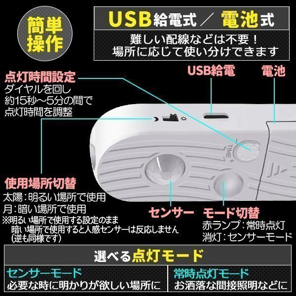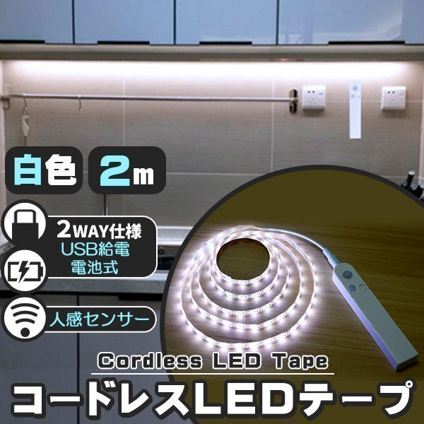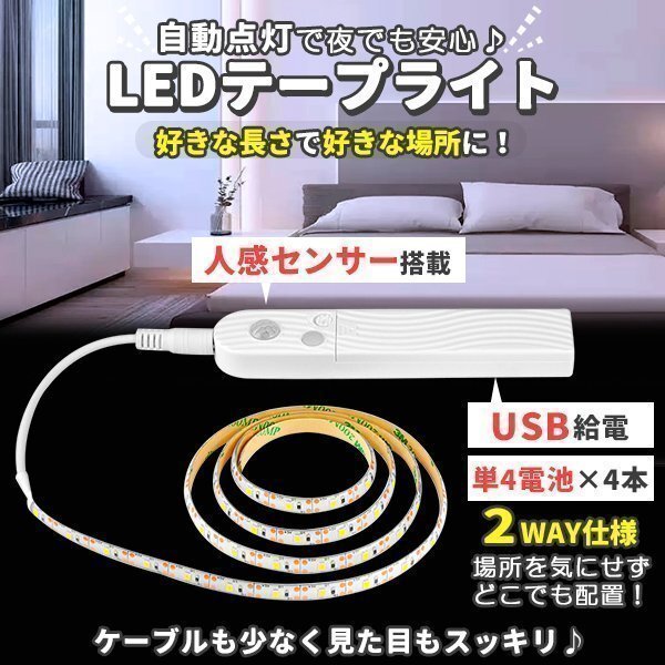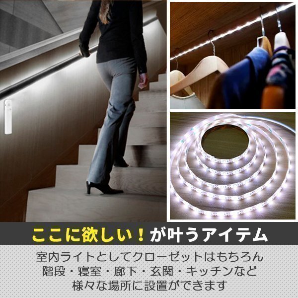 ★ LED テープライト 人感センサー付き 2m 白色 昼光色 USB式 電池式 充電不要 LEDテープ 階段 間接照明 棚下照明 フロアライト 足元灯