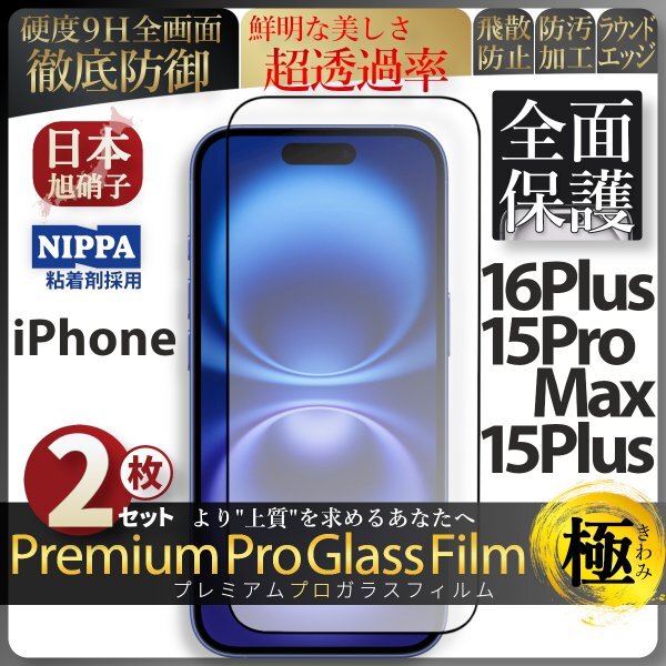 iPhone 16 Plus iPhone 15 ProMax iPhone 15 Plus 全面保護 強化ガラスフィルム 超得2セット 旭硝子 自動吸着 保護フィルム 液晶保護