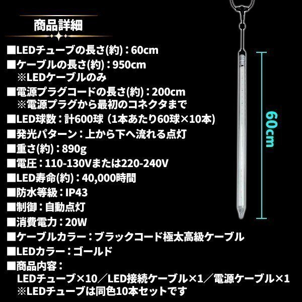 イルミネーション 屋外用 つらら スノーフォール 10本 60cm コンセント式 防水 ゴールド