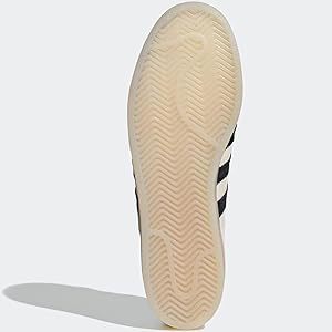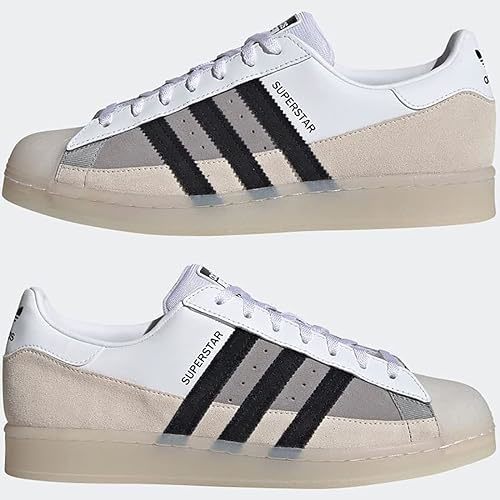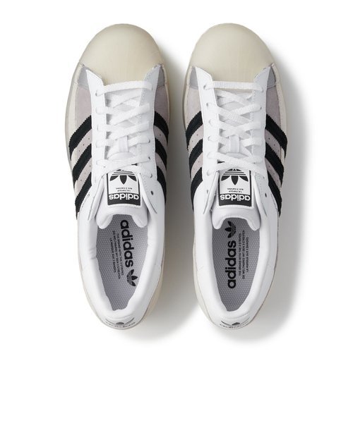 | 商品に関わる特徴・私的な感想 | アディダスのスーパースターシューズからインスピレーションを得たデザインを着想源にした、スーパースターが登場。意味が分かるようにもう少し説明しよう。このシューズのベースとなっているのは、アイコニックなラバーシェルトゥを用いた、アディダスのスケートボーディングシューズ。異素材ミックスのアッパーを採用し、わずかにコントラストの効いたカラーと、定番のギザギザの3ストライプを合わせている。半透明のディテールがスタイルを格上げしてくれる。 |