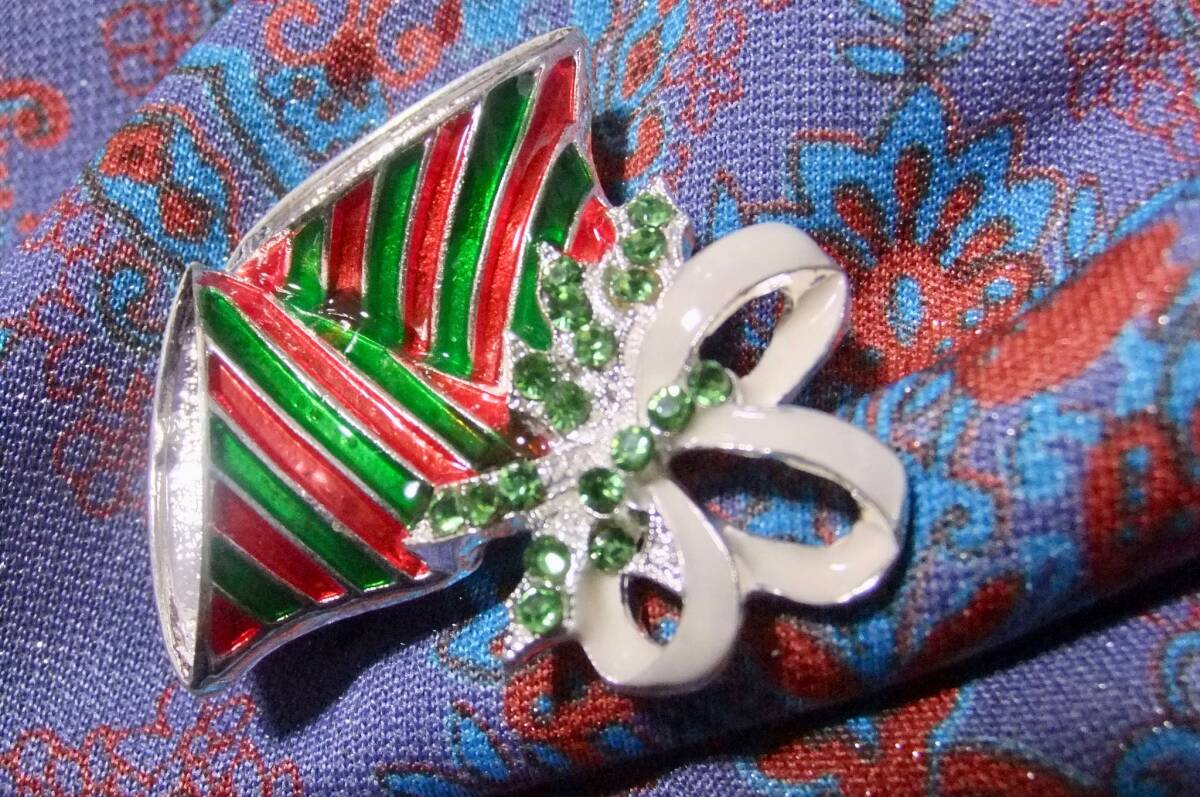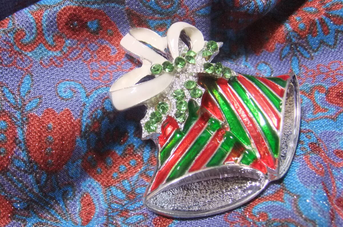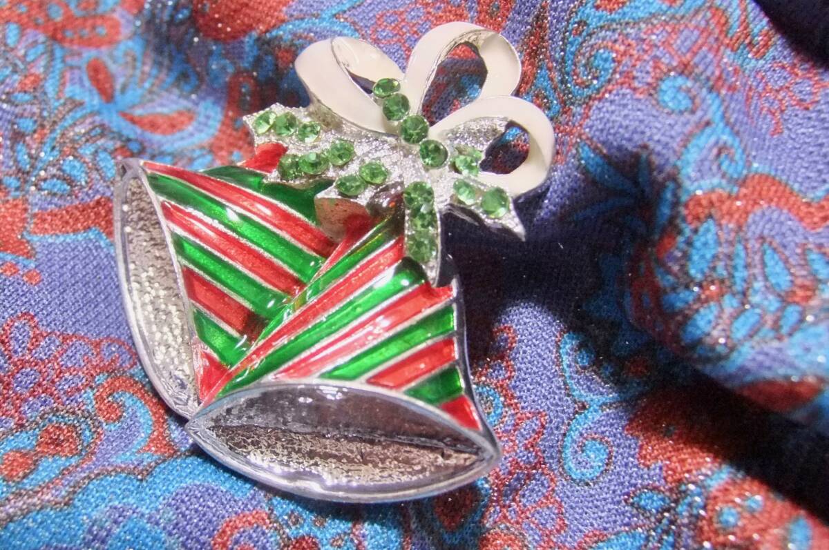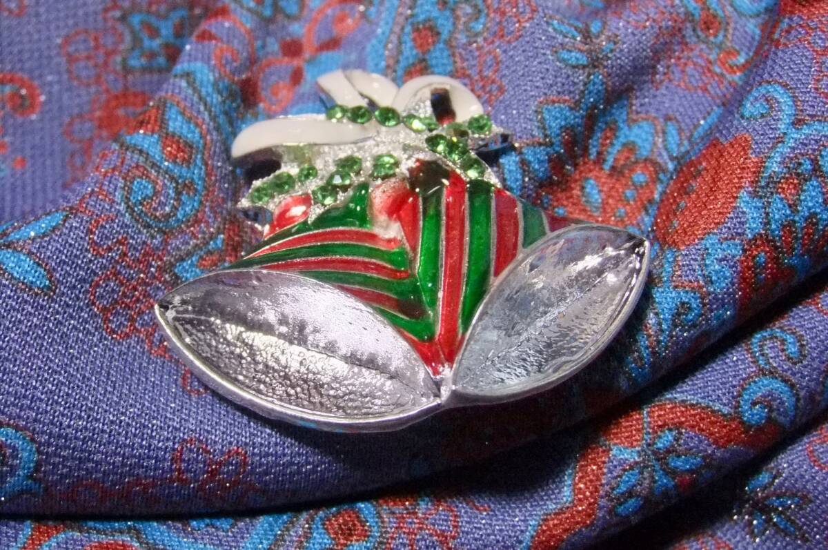 未使用品:リボンと柊のクリスマスベルのブローチ B-10