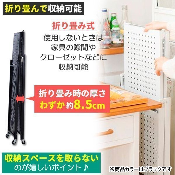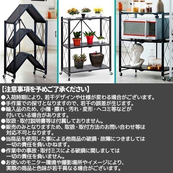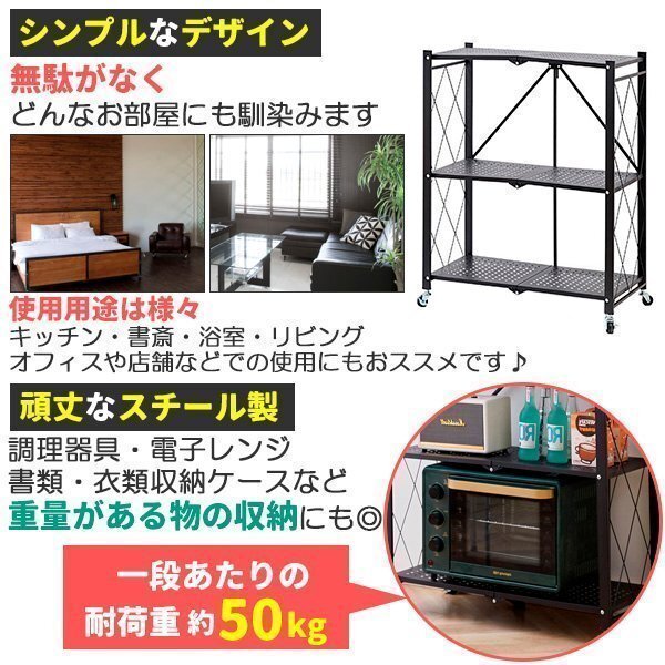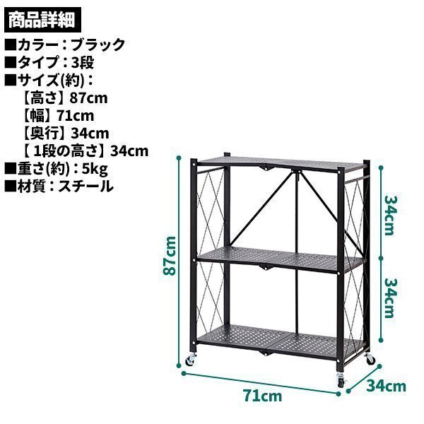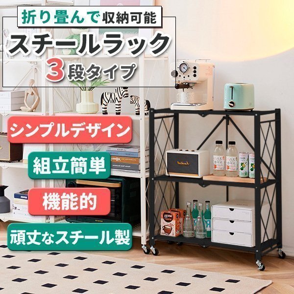収納ラック 棚 金属シェルフ スチールラック メタルラック 折りたたみ 折り畳み スチール棚 キャスター付 組立簡単 頑丈 ブラック 黒 3段