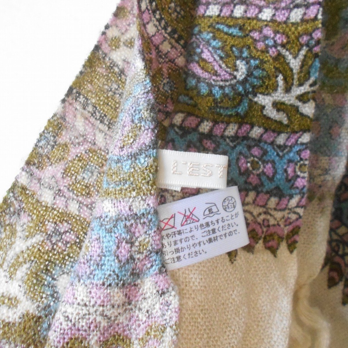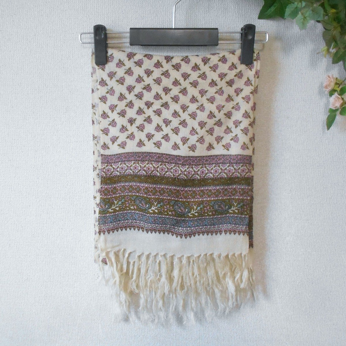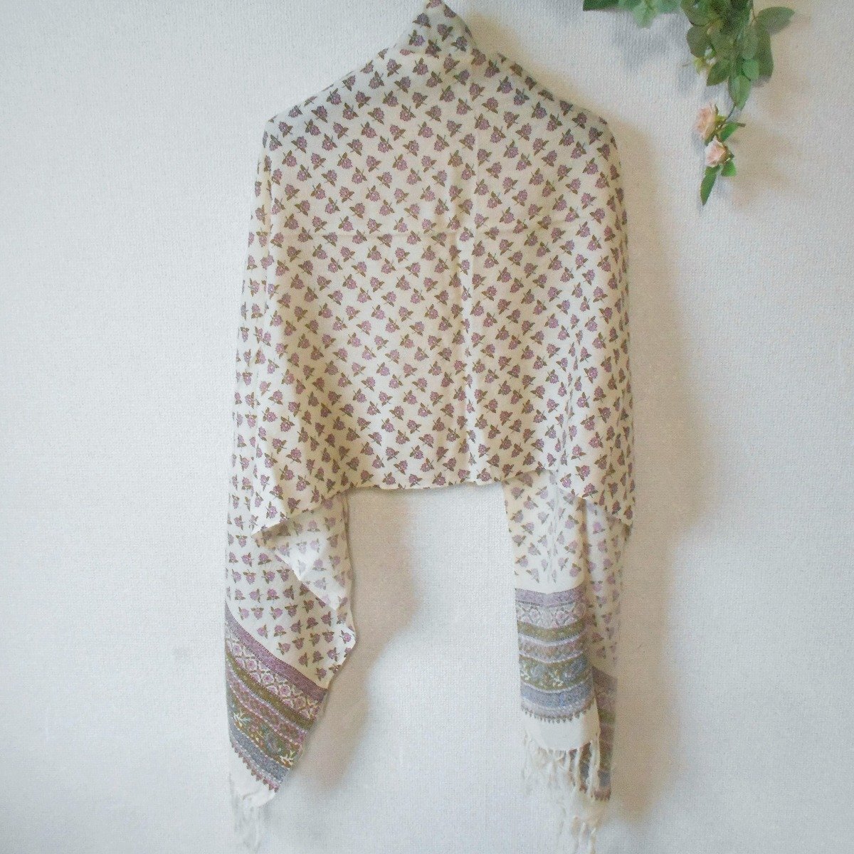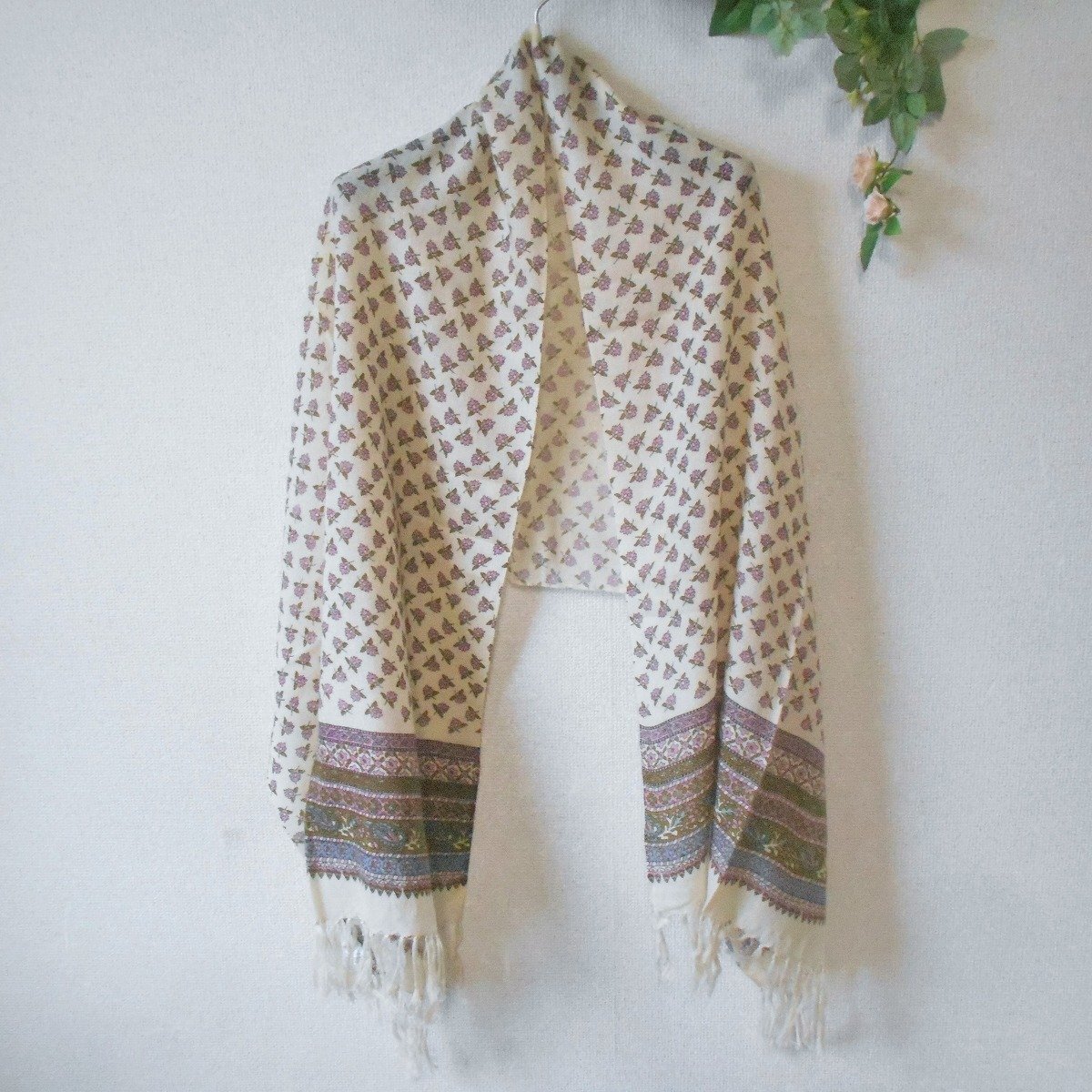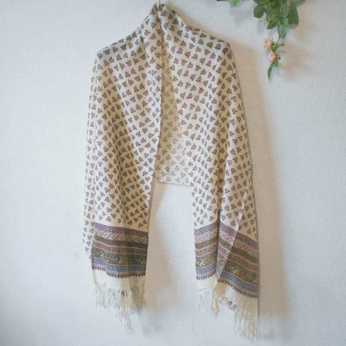 【ポイント】レストローズの薄手大判ショールになります。お色はベージュ系ベースで秋冬春の3シーズン使えるお品です。