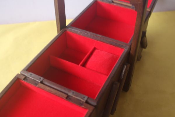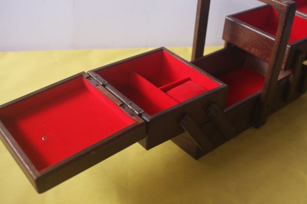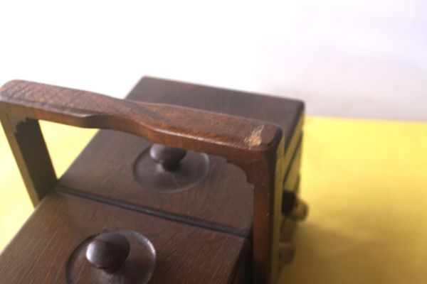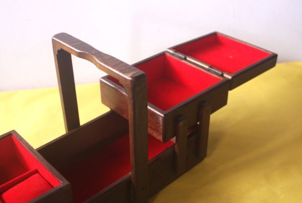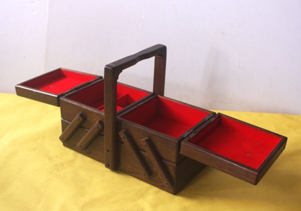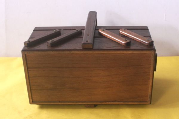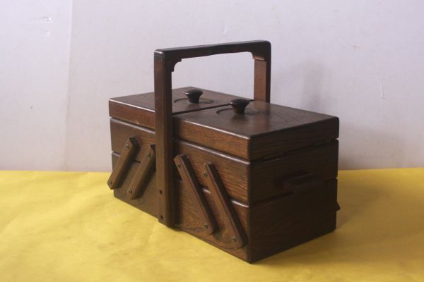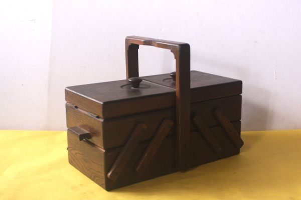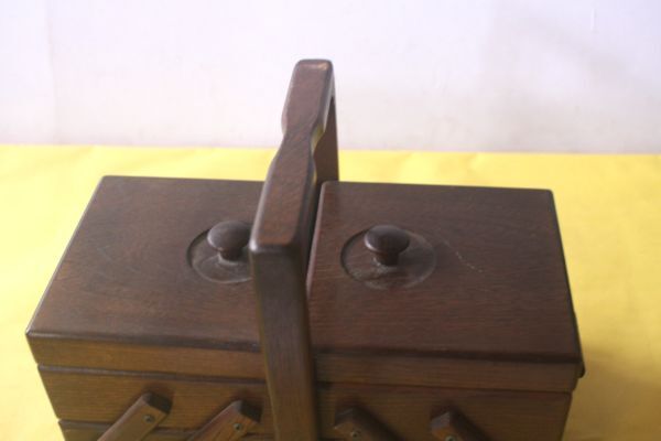 レトロ 木製2段 裁縫箱 ソーイングボックス 持ち手つき 稼働式 サイズ:W35×D18.5×H24㎝/27N11.6-9