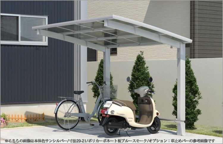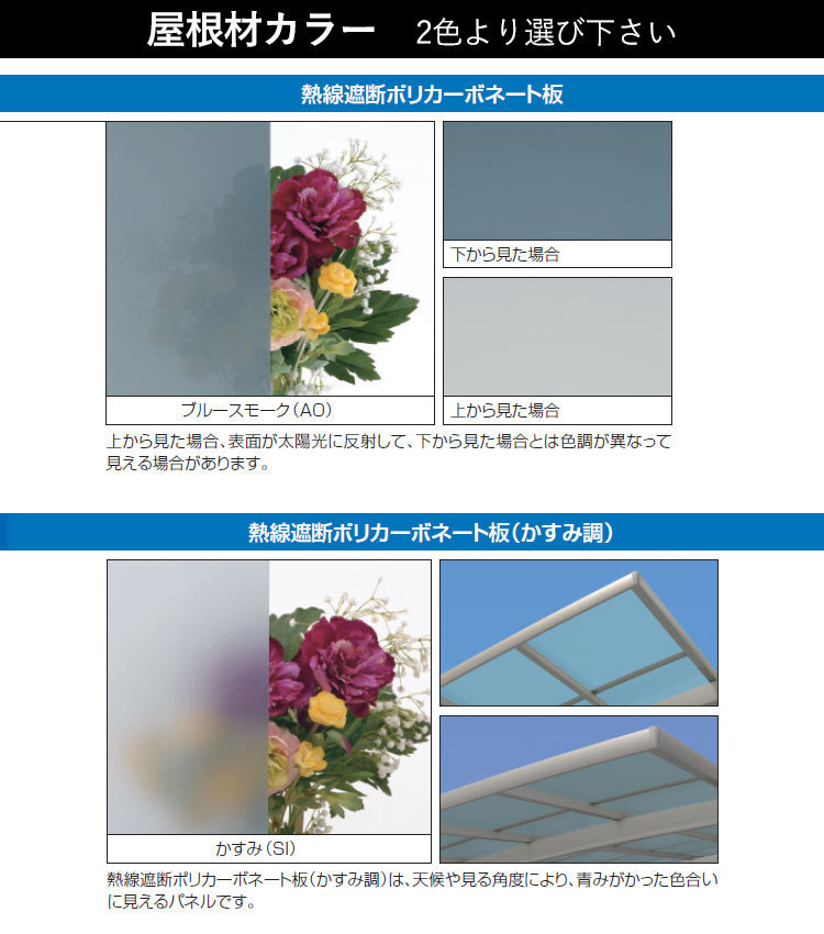| カラー | 本体色:サンシルバー、アーバングレー、ダークブロンズ、ブラック、ホワイト、ブロンズ 屋根材:熱線遮断ポリカーボネート板:ブルースモーク、かすみ |