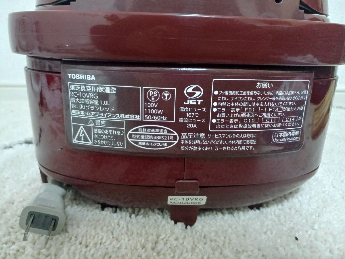 製品名:東芝 真空IHジャー炊飯器 RC-10VRG (グランレッド)。