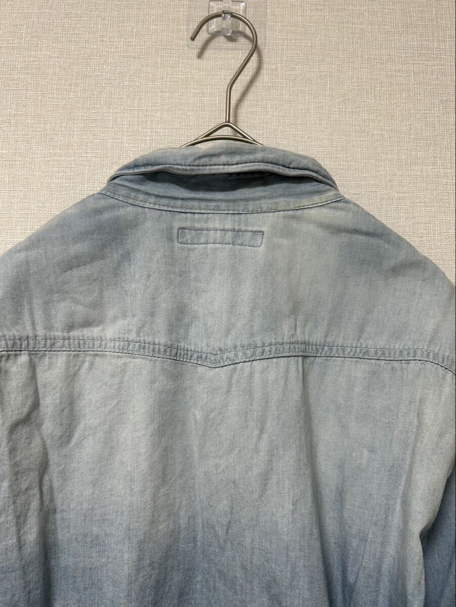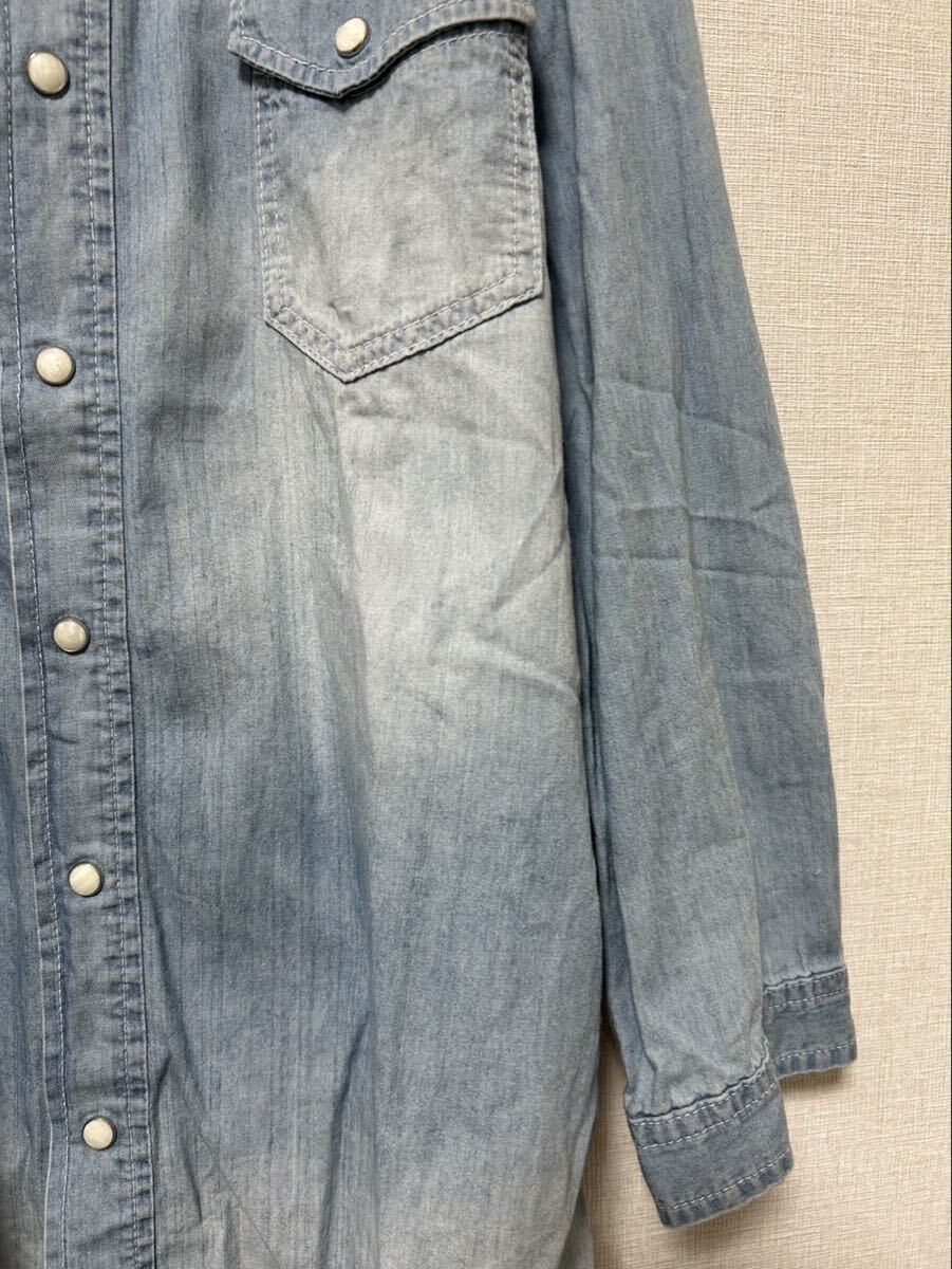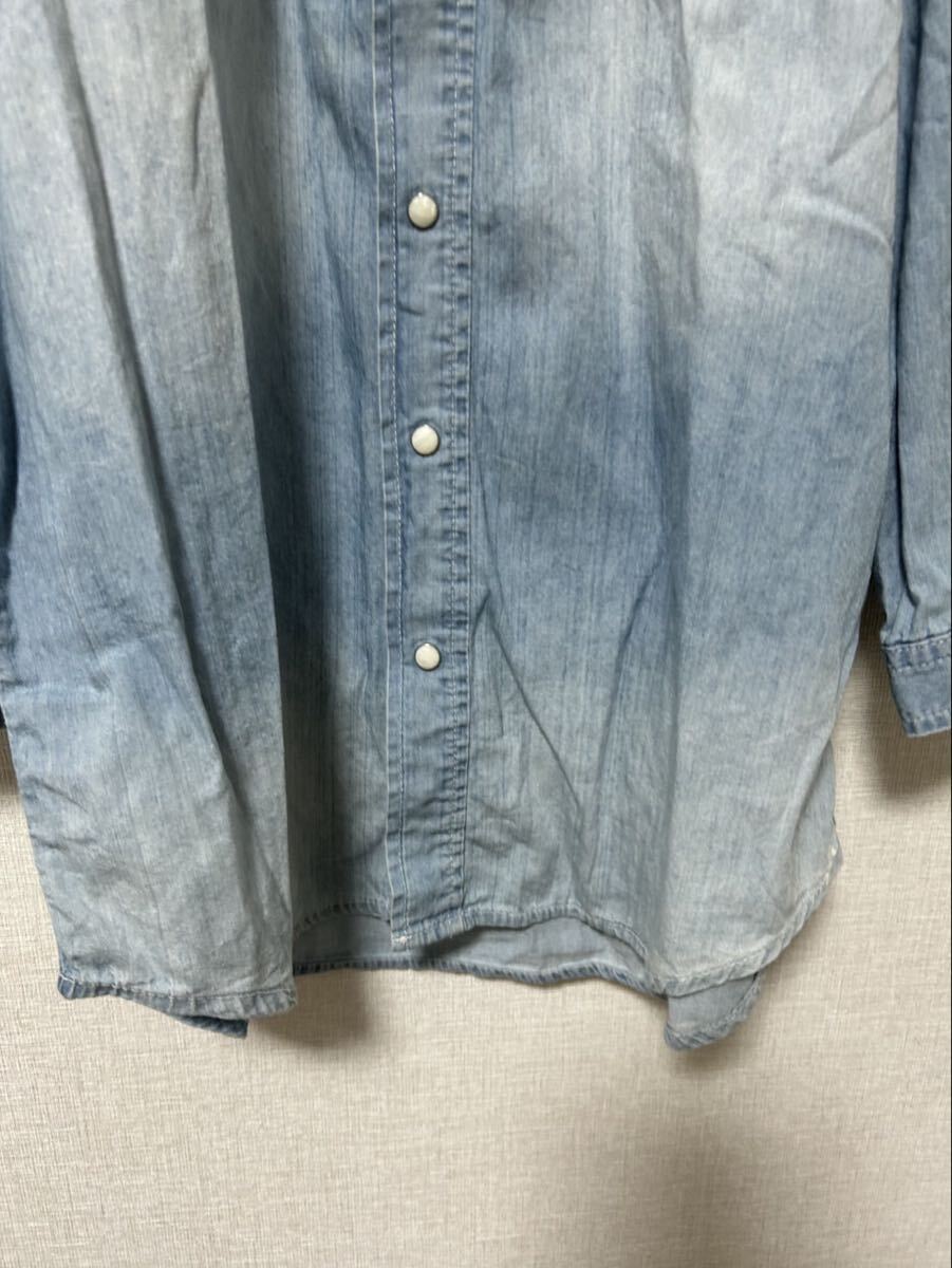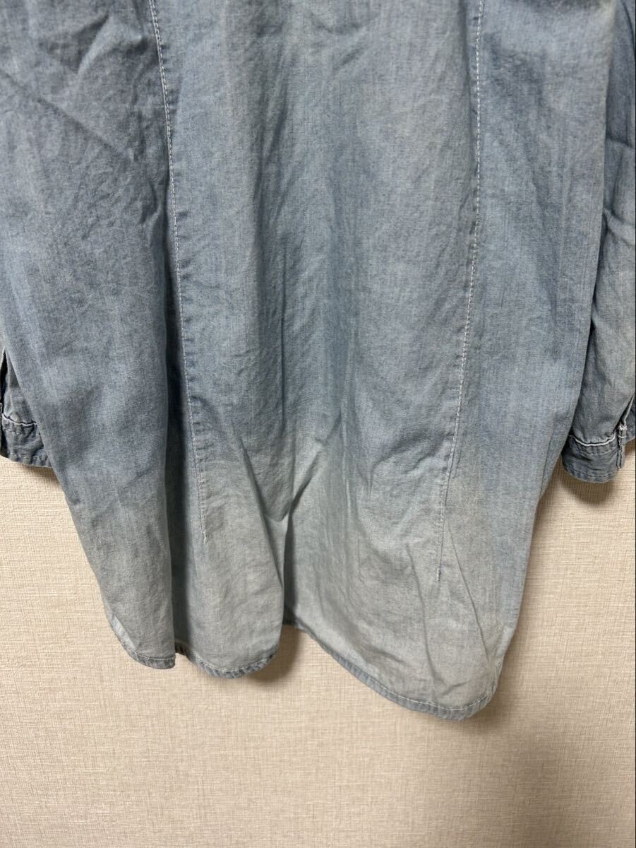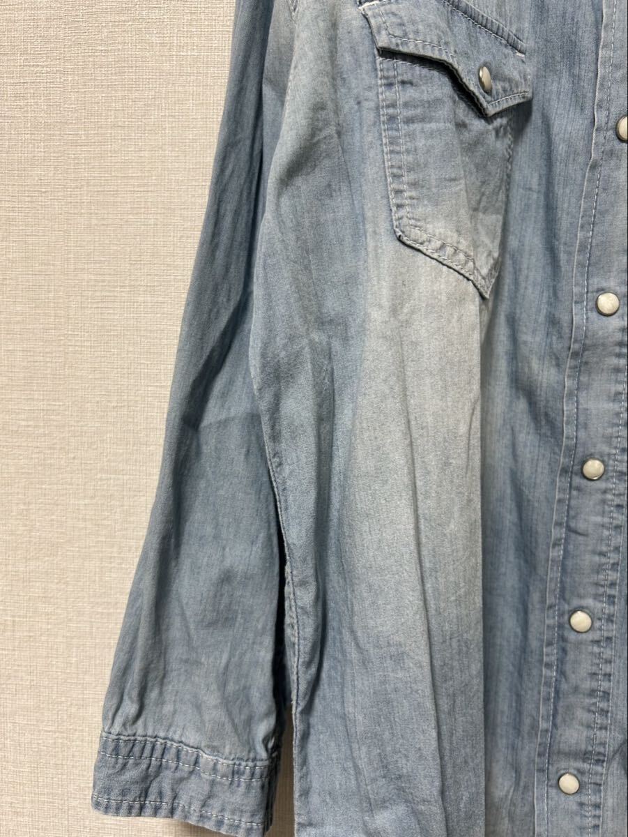 デニムブルーの7部袖 長袖シャツ、フロントポケット付きでカジュアルに最適。
