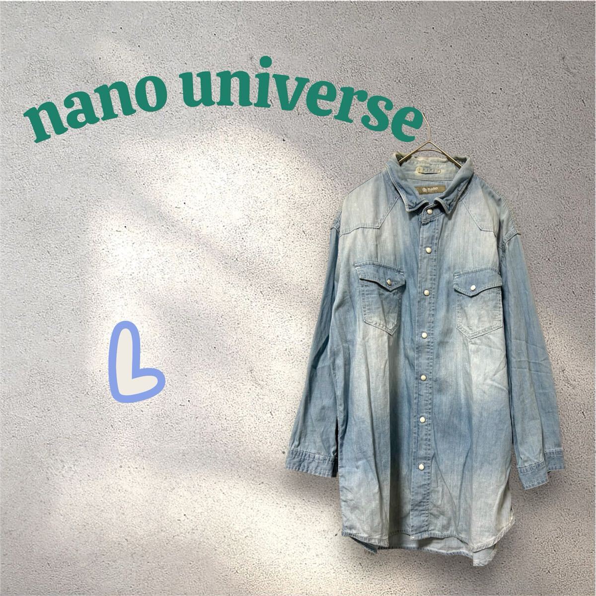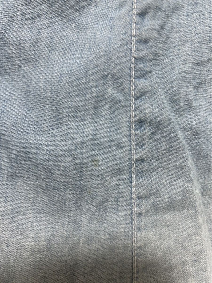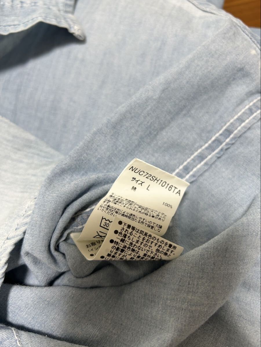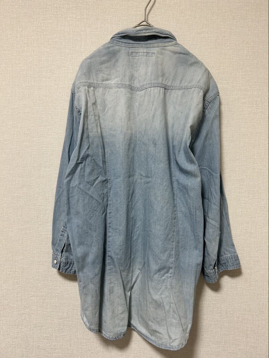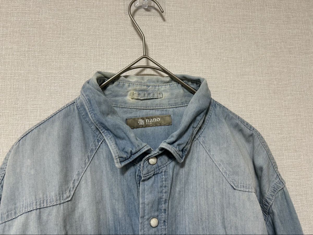 デニムブルーの7部袖 長袖シャツ、フロントポケット付きでカジュアルに最適。