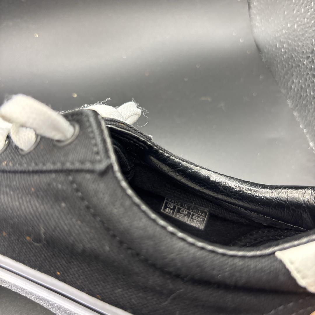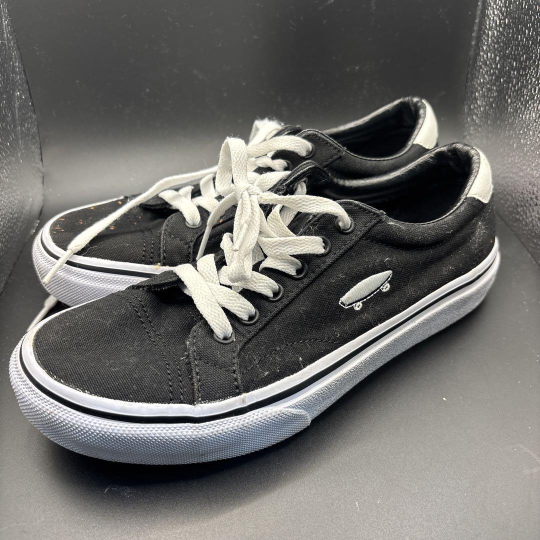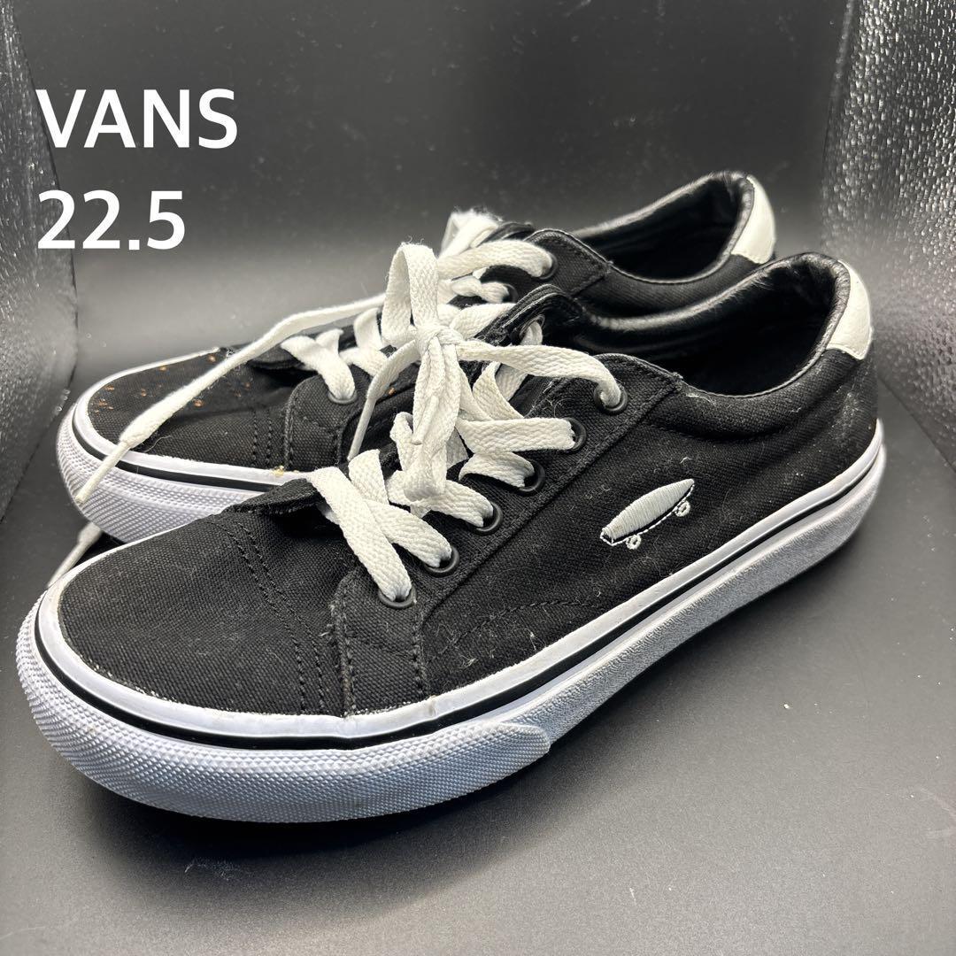 キャンバス素材のブラックスニーカー、VANSロゴ入り。
